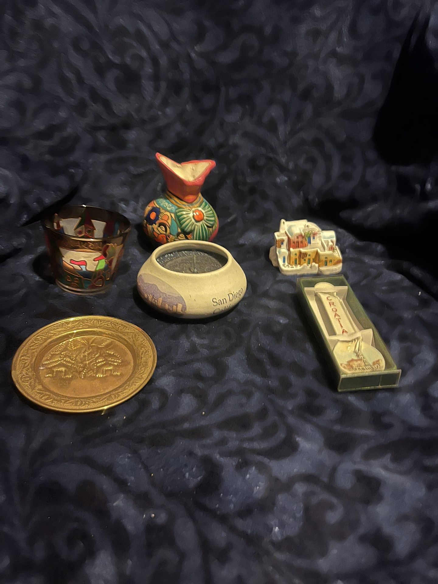 Mexican hand painted mini vase 4”high 3 “ wide, San Diego candle, stained glass candle holder krakow Poland, traditional Santorini village Greece, Croatia spoon, little plate Turkish? All small pieces no bigger than 4 inches $ 25.00