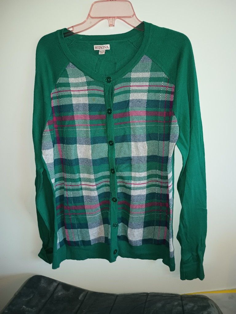 Merona Cardigan Size Extra Large Green Pink White Plaid Button Down Cotton Blend Womens in excellent condition no rips or stains. Local pickup in Saugus and cash only please.