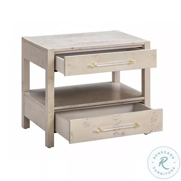 Modern white burl finish with two drawers and an open shelf, solid, stylish, and well-made. This nightstand currently retails for $449 before tax. Dimensions: • 26” W × 17” D × 22” H Same day delivery available