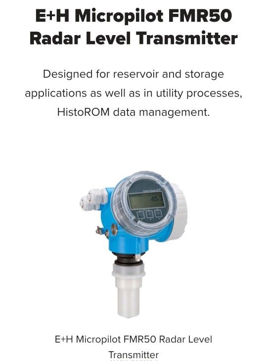 The E+H Micropilot FMR50 Radar Level Transmitter is designed for simple reservoir and storage applications as well as in utility processes. The FMR50 free space radar is used for continuous, non-contact level measurement of liquids, pastes, and slurries. The measurement is not affected by changing media, temperature changes, gas blankets, or vapors. Remote access with SmartBlue app via Bluetooth module is available.