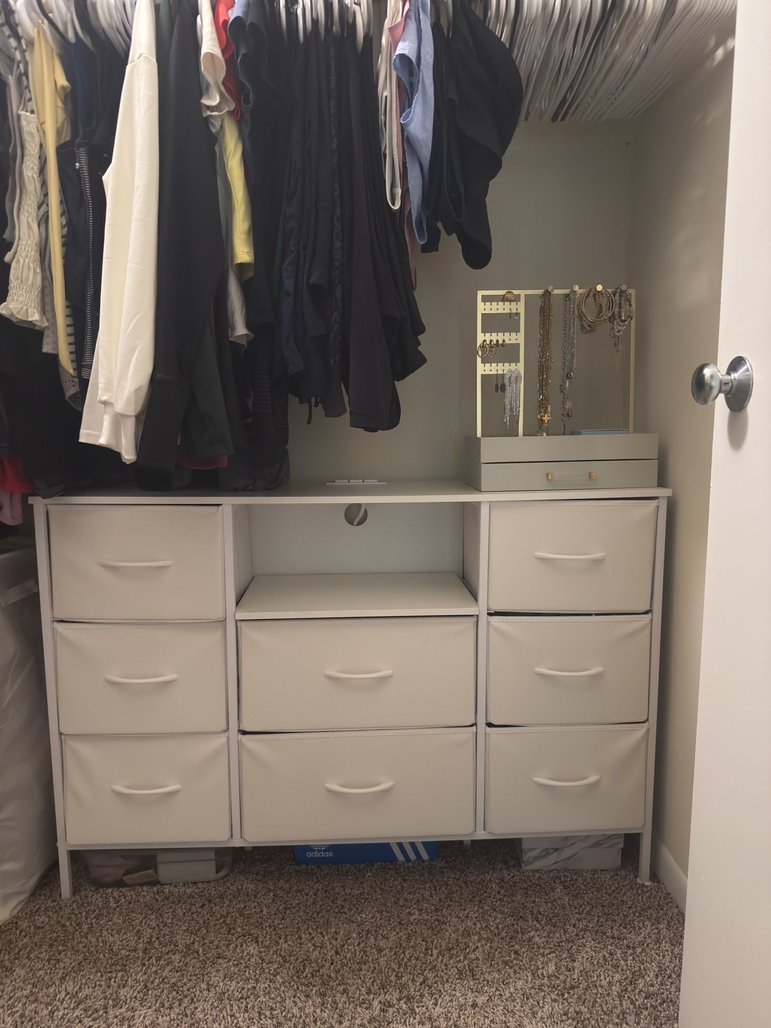white dresser with plug on top and fabric drawers