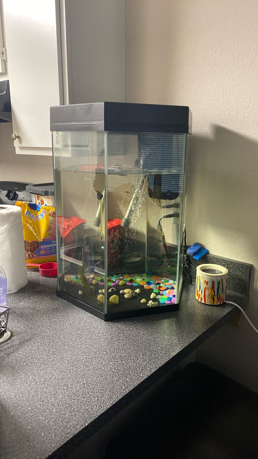 20 or 30 gallon hexagon fish tank Heater, filter and decorations included I also don’t want the guppies inside so those are included if wanted as well