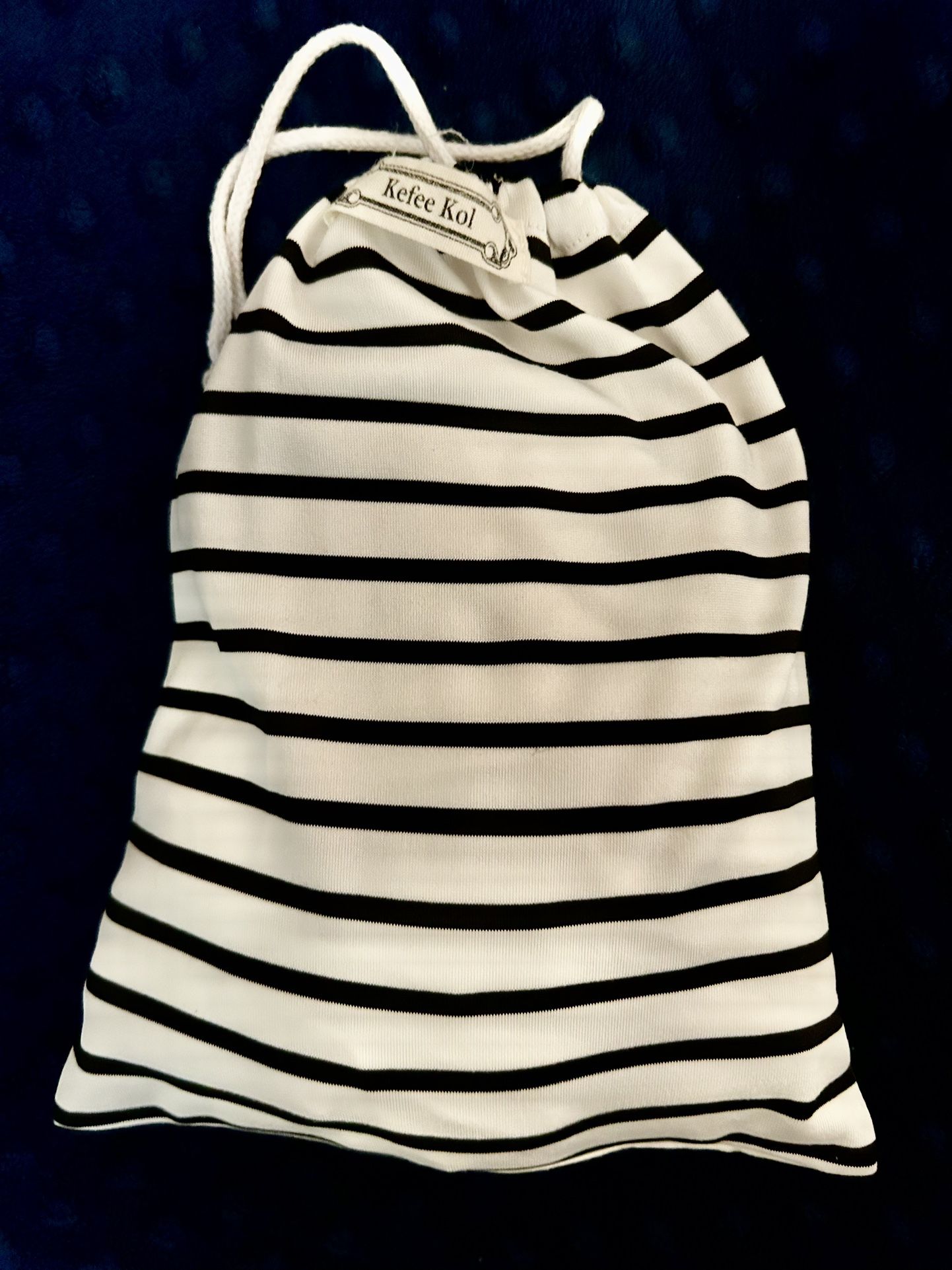 New condition. White with black stripes, can wear as poncho. Has small pocket and carrying bag. nursing cover/ shopping cart cover/car seat canopy/stroller cover/light blanket/highchair cover/diaper changing cover/poncho. Spandex poly cotton