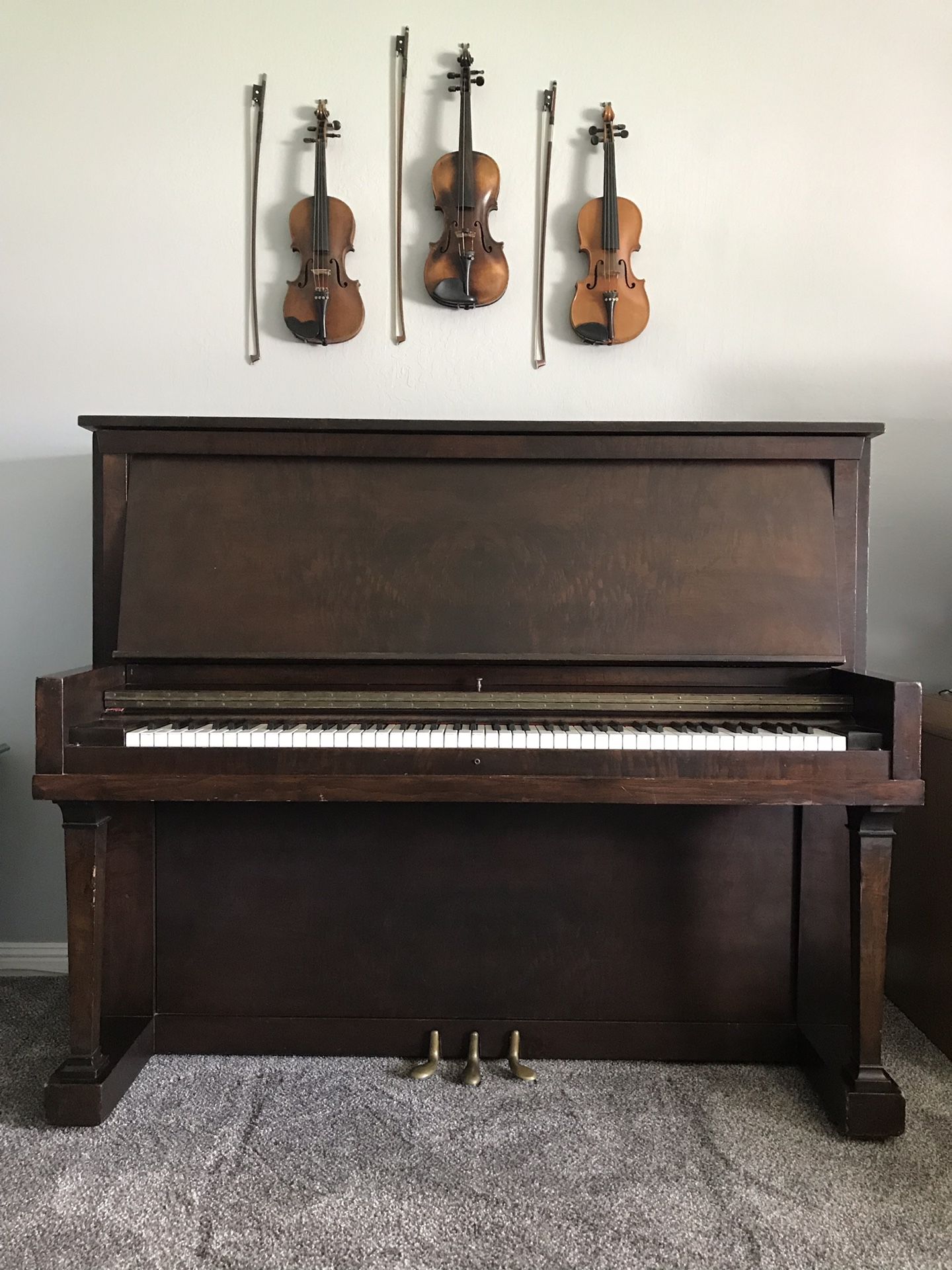 Chase upright piano with storage bench. Piano made in 1914, Mahogany, clear melodic tone. 58” wide and 50” tall. No keys stick. Take it home, have it tuned and ready to enjoy!