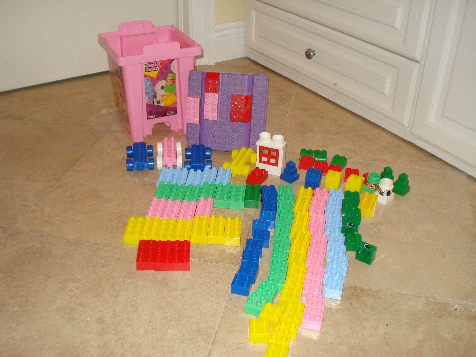 Vintage Used Mega Bloks as pictured. The container says 70 pieces, but I did not count. There may be missing pieces. These are from my daughter's collection of toys and has been put away in a closet for many years. Handle is broken off container. Sold as is.