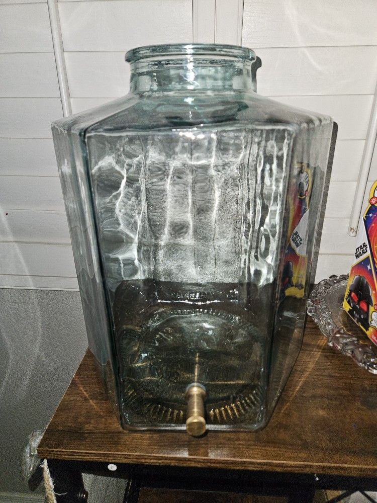 5 gallon vintage drink dispenser. Glass is perfectly fine. I used for my wedding, no longer need. Did notice the golden valve to dispenser works fine but if you do not close it all the way it will leak. Message me if you have questions