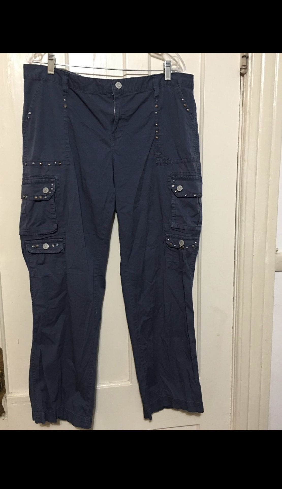 In great condition these blue Color vintage Gitano cargo pants. The blue color and embellished detailing make these pants perfect for a Y2K or 90s enthusiast . The cargo style provide a comfortable and functional fit, while the brand name adds a touch of nostalgia. These pants are a must-have for any fashion-forward woman looking to add a vintage touch to their wardrobe. Size is 16W Inseam is 30 inches The waist is 19 inches #23