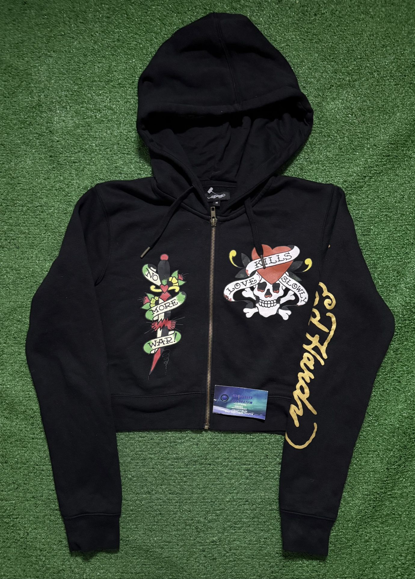 Hoodie is size medium in women and is in great condition. From top to bottom it measures 17 inches and 19 inches armpit to armpit.