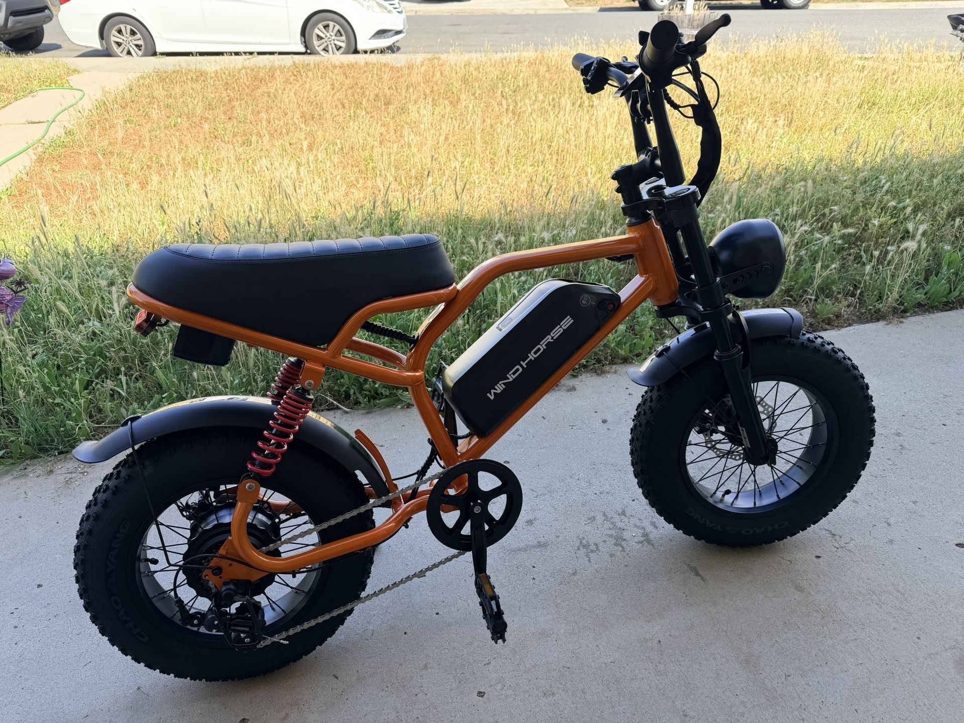 Electric Bike Cafe racer Windhorse Mini V8 750 watt motor Top speed 28MPH 50 mile range 48V 15ah battery 16”X4” fat tires Disc breaks 7 speed Shimano gears Full suspension front and rear. Lights in front and rear Blinkers in rear Horn 2 keys Charger Special speaker on bike for music or fake motorcycle sounds. It’s unbelievable and must be seen to believe. Any young or old person would love this bike. Recommend for shorter riders