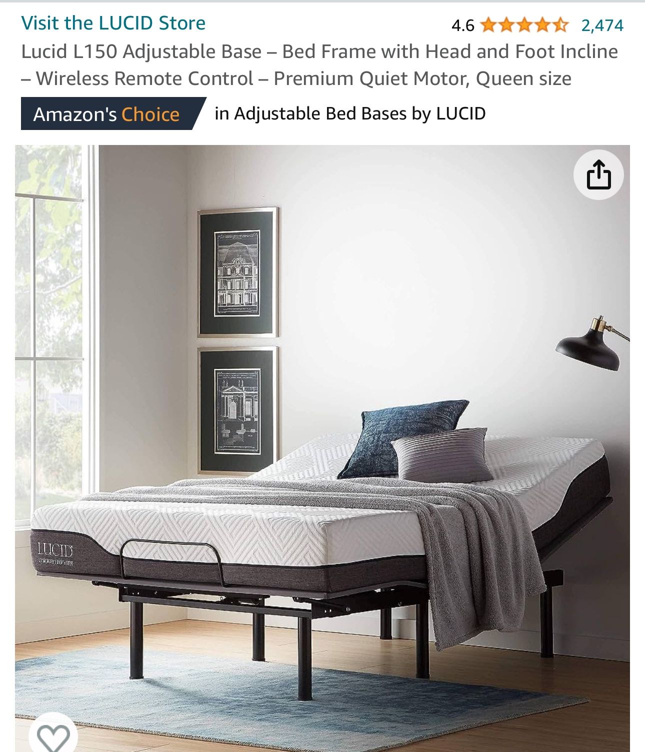 About this item COMFORT BENEFITS – Adjustable bed makes it easy to relax at night, read, or watch TV. Additional benefits include reduced snoring, sleep apnea, and acid reflux. WIRELESS REMOTE – Bed Frame includes a wireless remote for easy control access with user friendly head and foot incline COMPATIBLE WITH MOST MATTRESSES – Bedframe is compatible with any Lucid mattress, most mattresses under 13 inches MADE TO LAST – Bed durability features a sturdy steel frame with an equally strong set of 12-inch legs and a weight capacity of 750-pounds EASY ASSEMBLY – Assembly takes less than five minutes. Two Twin XLs equal one King bed frame, working independently with two separate mattresses, or synced together for one whole King size mattress
