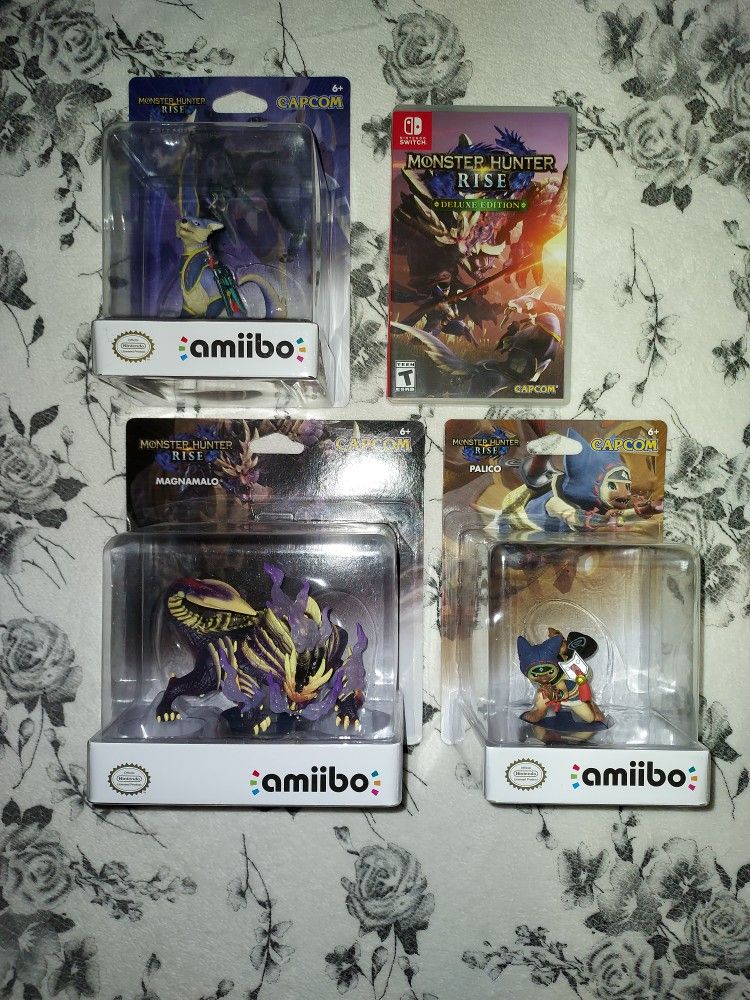 Sealed Amiibos and opened copy of Monster hunter Rise deluxe edition