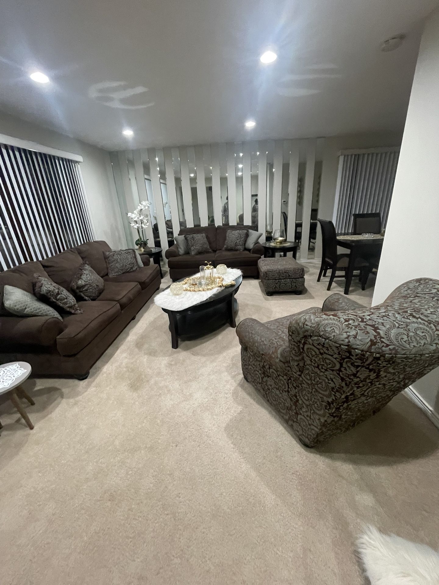Price is negotiable. There are scratches to the table, but not too noticeable comes with four couches one long couch ,one small couch , one chair and one leg rest.