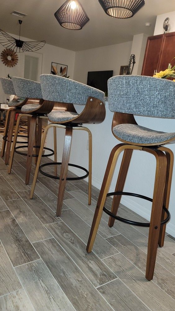 4 modern, grey fabric swivel bar stools, with wooden bar chair. Product Dimensions: 18.11"D x 23.43"W x 40.55"H 28.5" from the seat to the floor Great condition. Hardly used