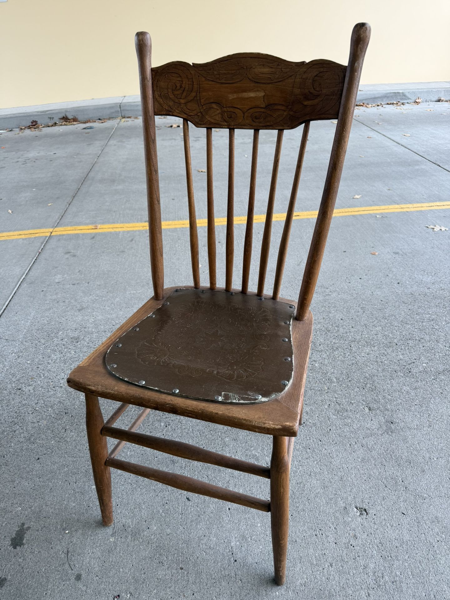Beautiful vintage wooden chair featuring a hand-carved decorative backrest and an embossed leather seat with floral detailing secured by metal studs. The chair has elegant turned stretchers and classic spindle supports, showcasing craftsmanship and age. It’s sturdy overall, with minor wear and some age-appropriate surface marks, adding to its authentic character. A perfect accent piece for rustic, farmhouse, or eclectic interiors — great as a decorative side chair, desk chair, or refinishing project.