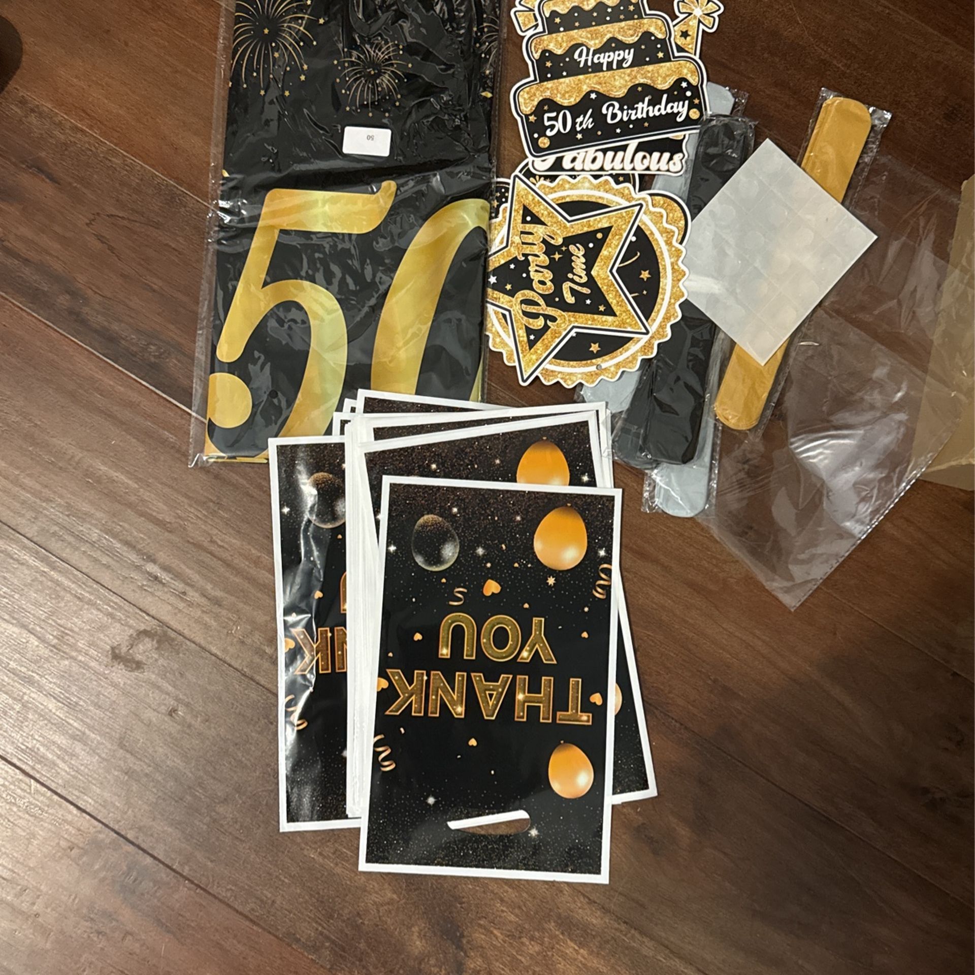 Black, silver & gold theme decorations for 50th birthday milestone. Price includes the following: -2 table clothes -1 huge banner -paper plates,cups -plastic silverware -table decorations -2 silver - gold party favors (bottle opener & wine stopper, koozies) -candles -many more items
