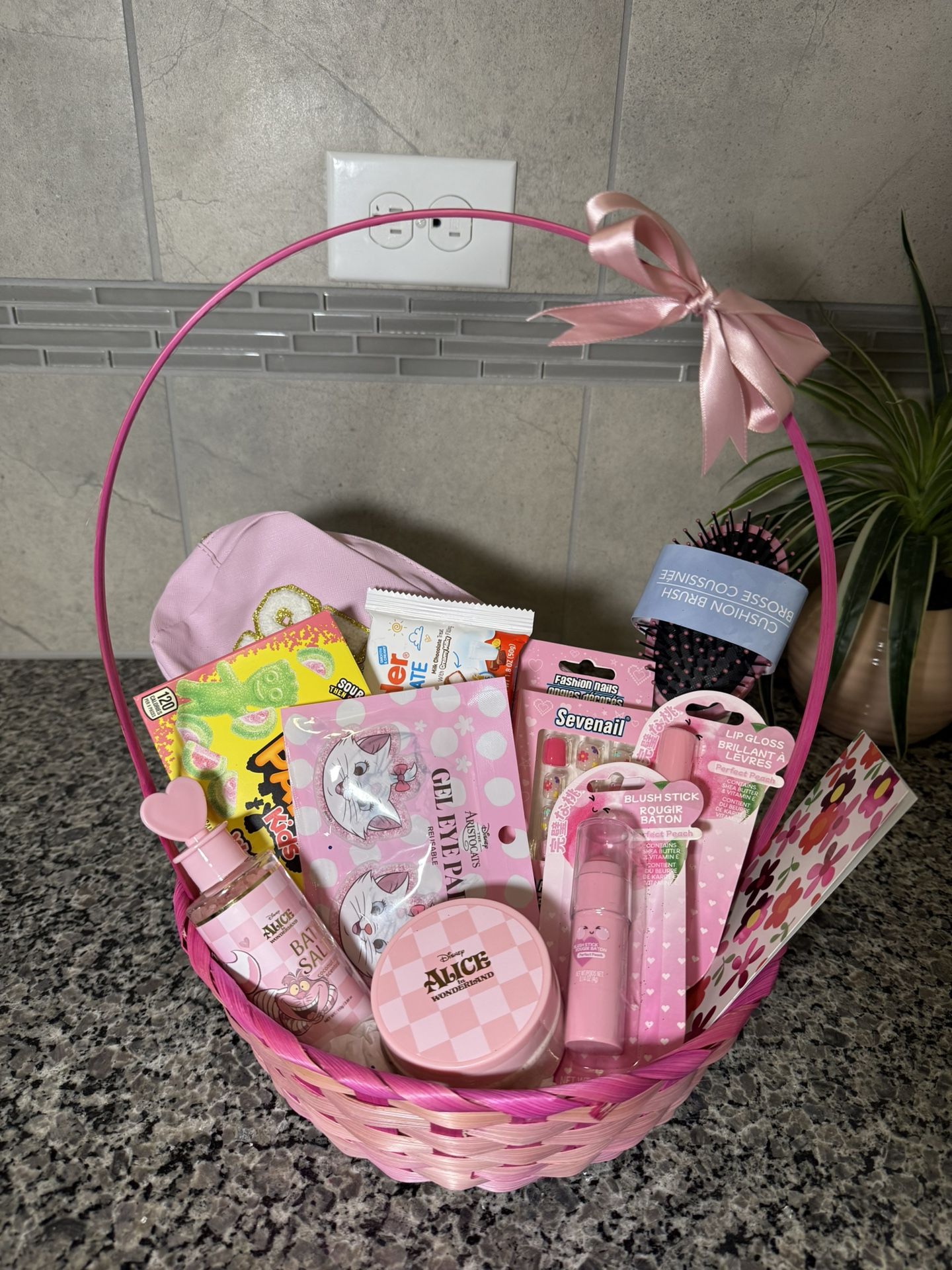 Pink perfection in one basket 💗 A mix of beauty essentials, snacks & self-care, perfect for girls or teens who love cute aesthetic goodies 🎀✨ Includes: ✨ Bath salt (Alice in Wonderland themed) ✨ Body scrub (Alice in Wonderland themed) ✨ Beauty gel pads (adorable cat design) ✨ Blush stick ✨ Lip gloss ✨ Hair brush ✨ Fashion nails ✨ Cosmetic pouch/bag ✨ Sour patch kids ✨ Kinder chocolate bars ✨ Greeting card