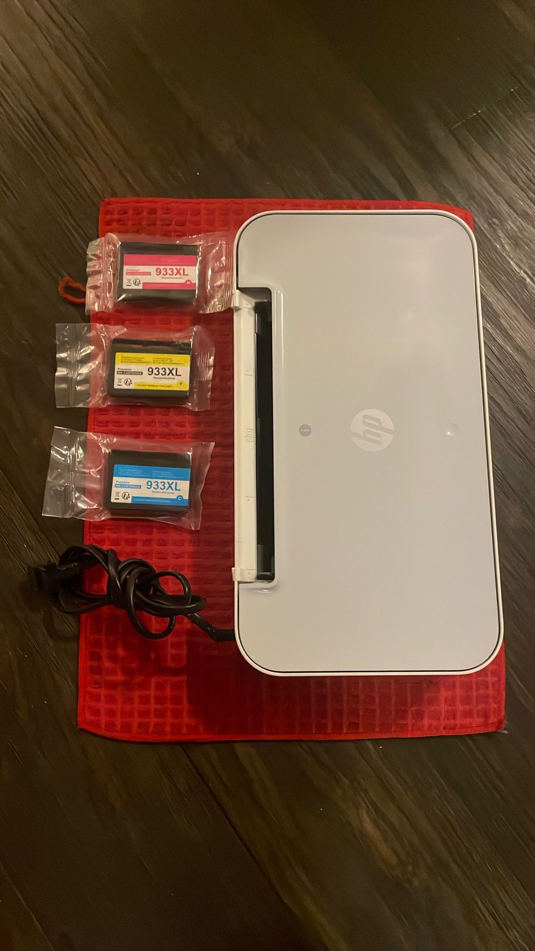 Compatible with iOS. iPhone . Macs. And windows pc. Bluetooth. . Comes with ink cartridges . Scans . Copy’s . You can also talk to it . . 100 buy . I want 85 bucks