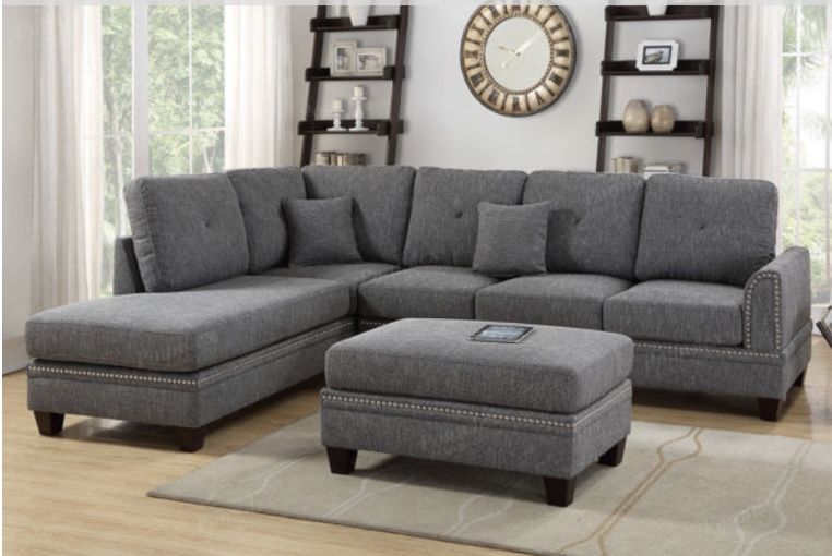 Sectional Sofa Ottoman Sold Separate Item # F6511 Sectional Item # F6515 Ottoman Suited for contemporary or classic living space, this 2-piece sectional features extra plush seating with pillow back and seats. Its frame is trimmed in nickel plated studs with short brown leg supports. Available in ash black (blended fabric, blue cotton (blended fabric), or citrus (polyfiber). Color: Ash black Materials: Polyfiber Plywood base panel with solid pine frame. Wood legs, fiber batting back cushion, Pocket coil seat cushion with foam encasement. Some Assembly Required Dimensions: Sectional: 112″ x 85″, Ottoman: 38″ x 26″ x 20″H