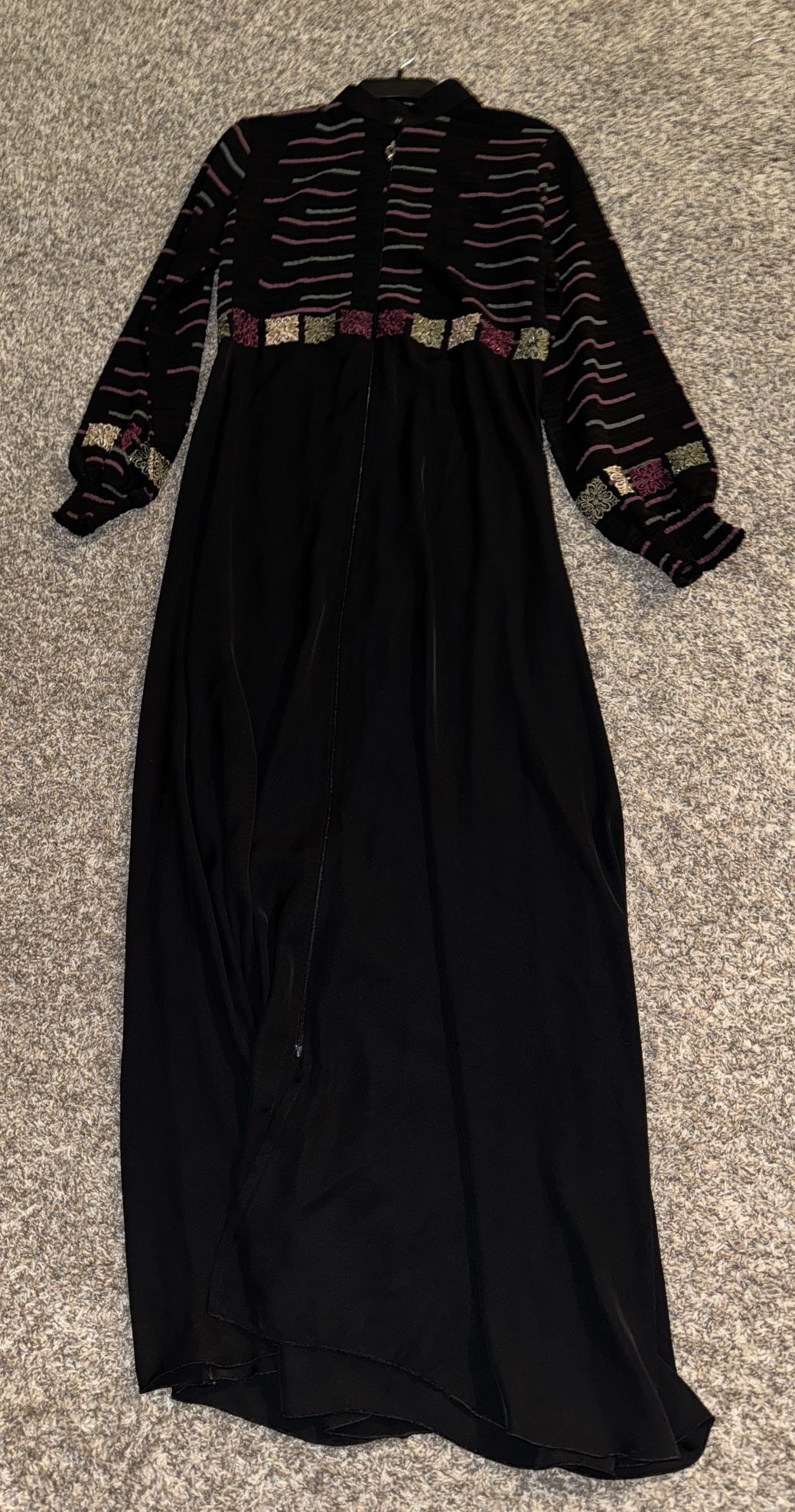 Embroidered abaya, open at the back, with a zipper at the front and fitted sleeves.
