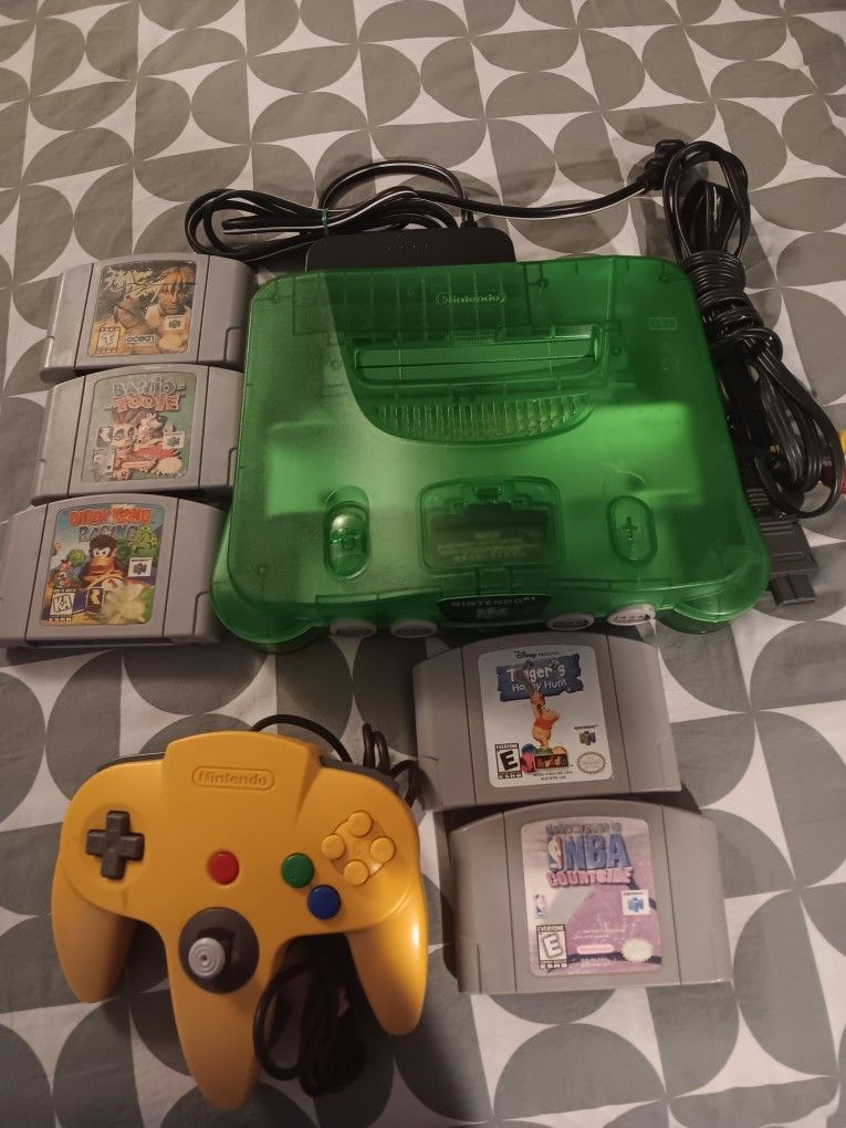 Jungle green Nintendo 64 complete with 5 games one yellow authentic controller all original connections With original jumper pack sticker still intact never tampered with. Price is firm low ballers will be ignored and blocked. Banjo tooie Diddy Kong racing Fighters Destiny NBA Courtside Tigers honey hunt