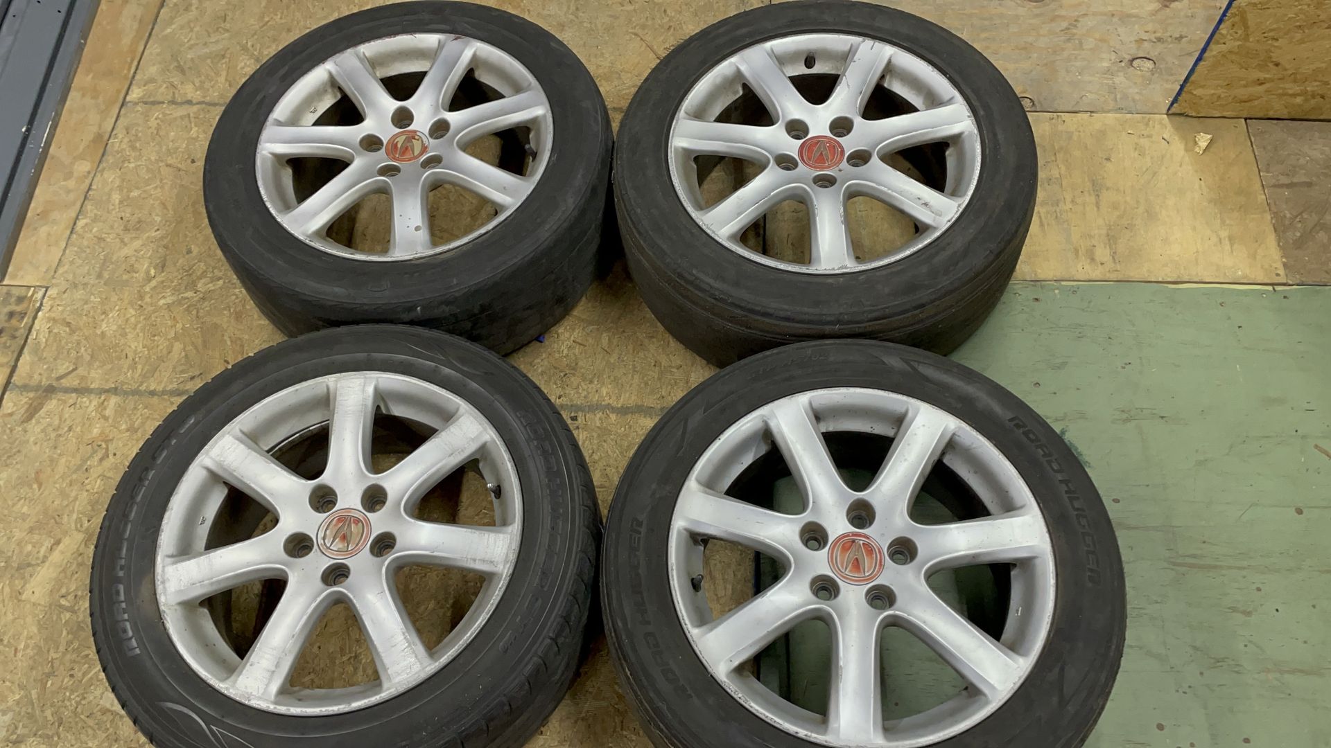 This is a set of four 17x7 inch original factory Honda aluminum wheels with a +45mm offset, from a 2004-2008 Acura TSX. The rims are all in good working condition, though one has a couple of minor dings on the front and back lips that may need to be repaired. The 5 on 4.5 inch (114.3mm) lug pattern is compatible with most five-lug Honda and Acura cars. All four tires are completely bald and must be replaced, though they currently hold air for use as rollers. This set is perfect for a daily driver, commuter, or as a replacement for a damaged set.