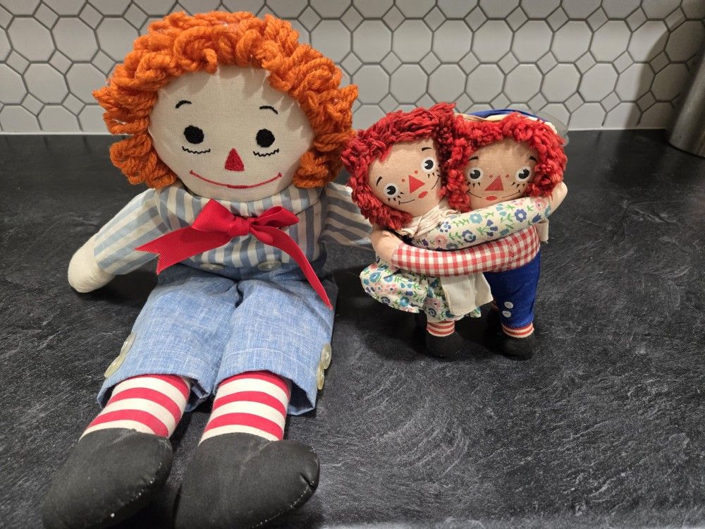 Vintage Raggedy Andy Doll And Raggedy Ann/Andy Hugging Knickerbocker Plush Dolls. Andy Doll is 19' The hugging dolls are 7.5'