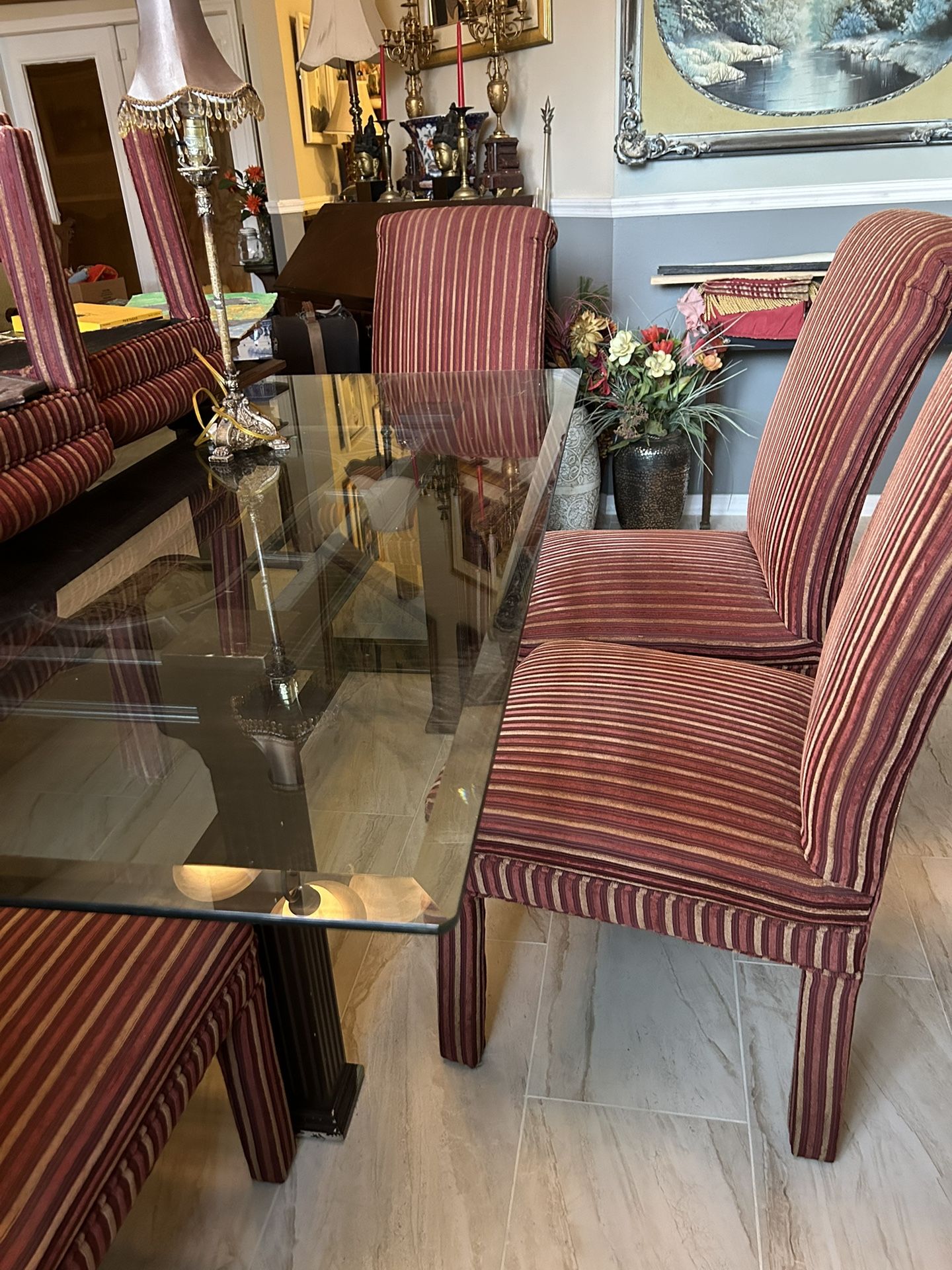 Glass top dining room table with six red clothed chairs. Black wooden center piece. All parts of the set are in great condition and very lightly worn. No scratches on glass top. No stains or rips on the chairs.
