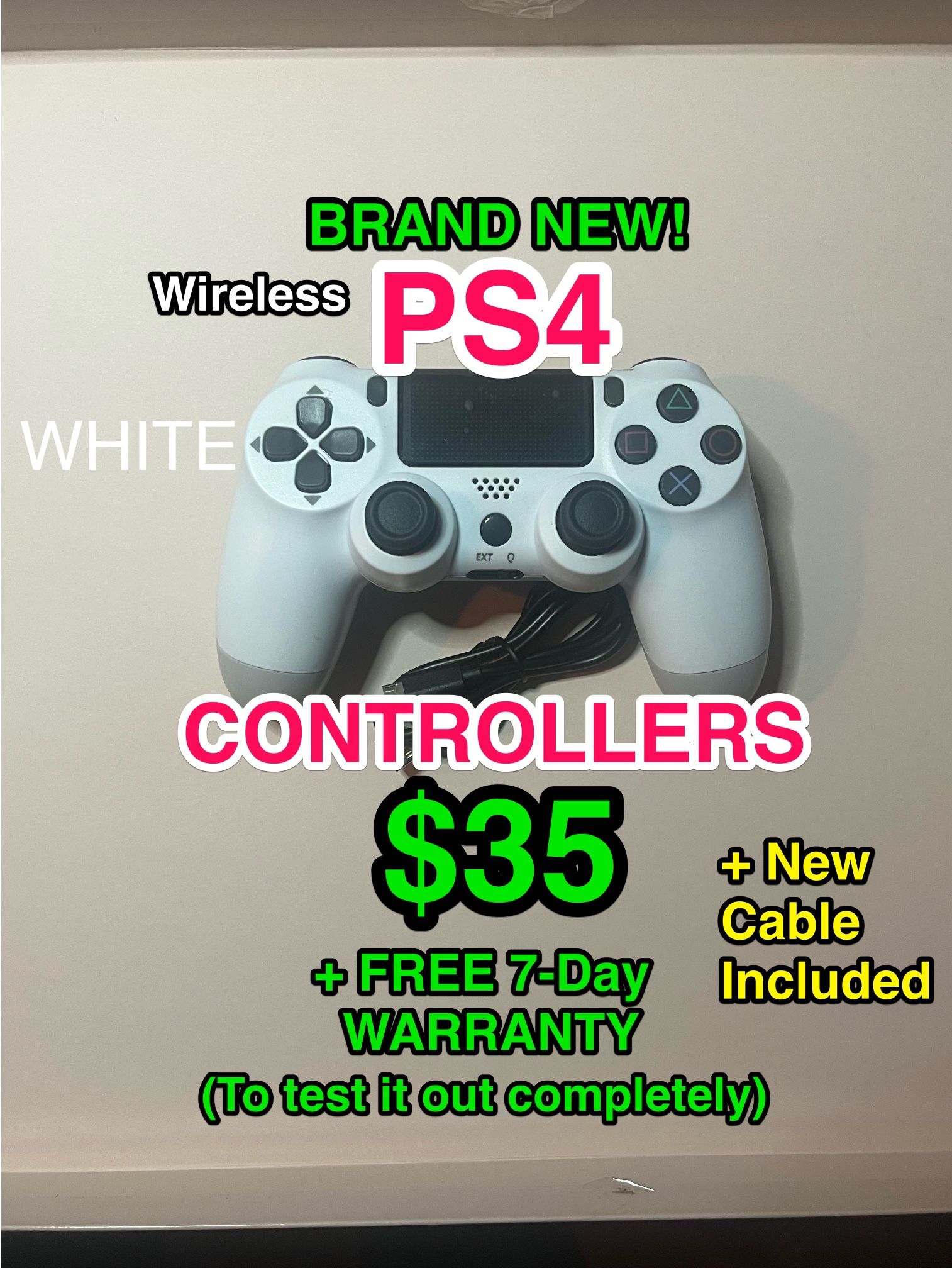 Hello everyone! This Listing is for: 👉 Brand New (WHITE) PS4 Wireless Controllers (3rd Party). Comes with a brand new charging / connection cable. 💵 Asking price is $35 each ⭐ Satisfaction guaranteed — or I am willing to compensate if necessary. 🛡️Each item includes a FREE custom 7-day warranty to test it out completely and give assurance. (If there is anything mechanical that disappoints you—I can personally repair it if possible, replace it with another new item, or provide a refund no stress and no worries.) ✅Special Notes: Discounts are offered for bundle purchases or for combining with other items on my page. (Please view/search my page for the listings that meet your current need and we can work out a deal.) 📦 Buyer Notice: Boxes, packaging, or protective coverings (if any) sometimes may show signs of storage wear including but not limited to scuffs, tears, dents, etc. 📩 Message me with any questions or to check availability. If this listing is available, then there will be more for sale. 📍 Pickups are in Paramount, CA 90723