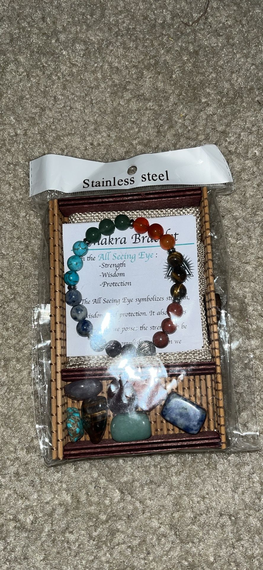 • Chakra Bracelet and Crystal set • one size • originally $20 • unopened • faux bamboo case