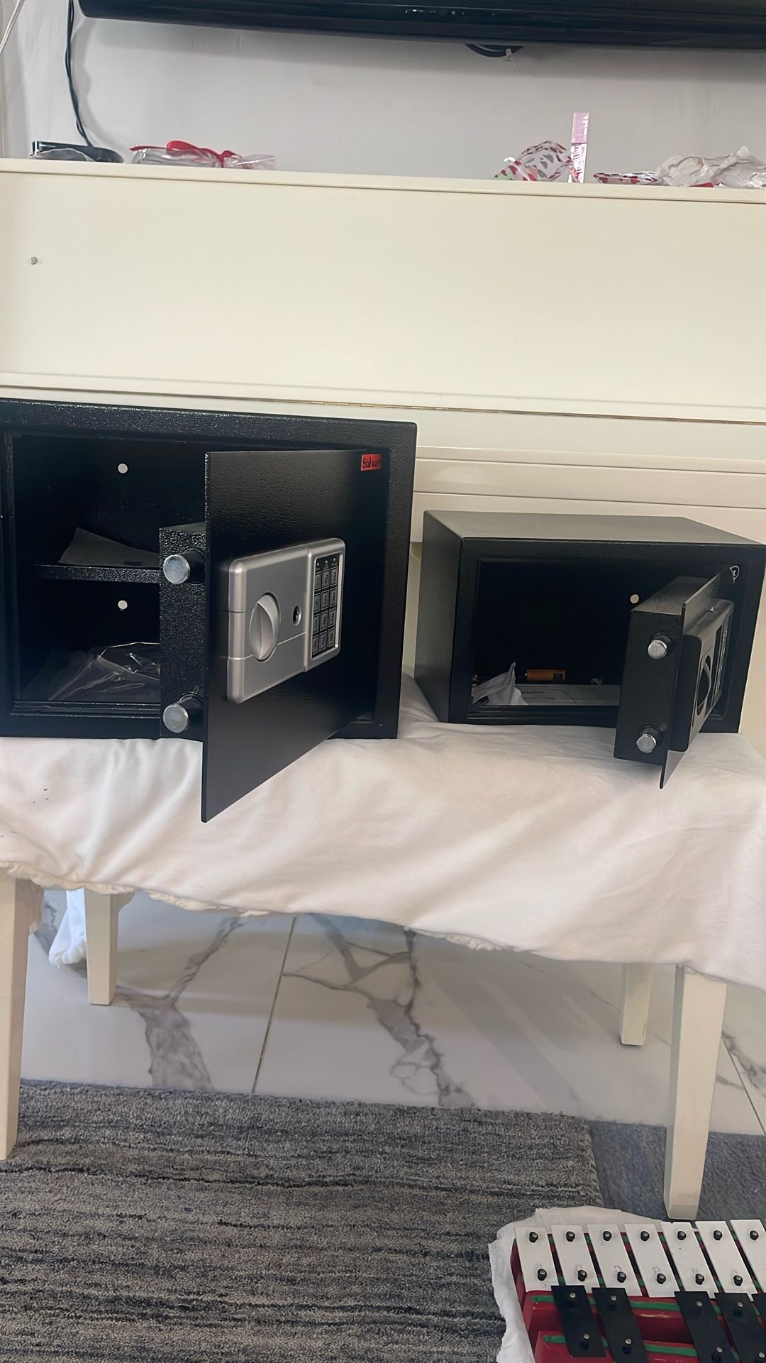 Steel heavy duty stalwart safes with key and backup battery can be used using code or key. There are two safes one is small the other big cube size.