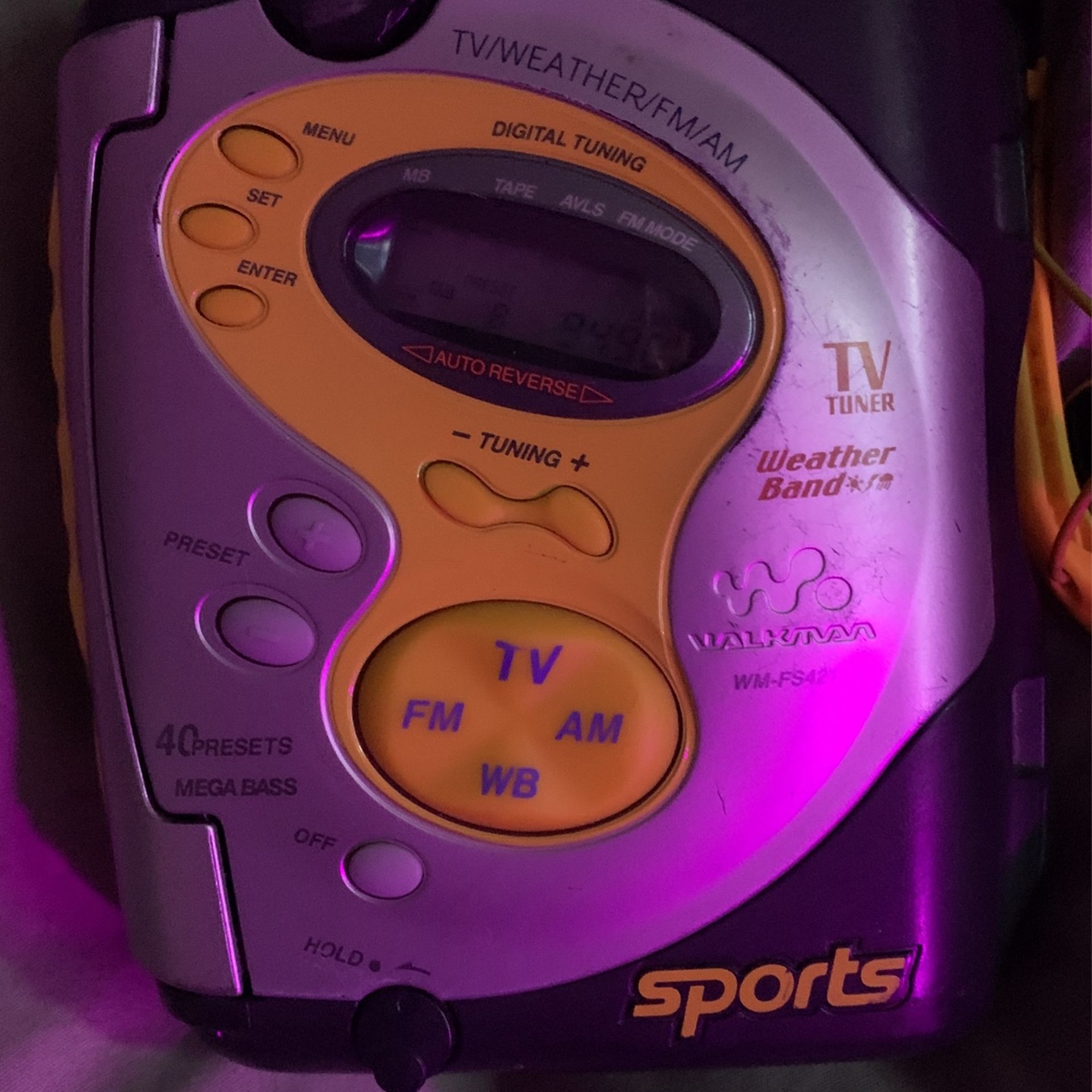 Cleaned, Tested and working with original headphones and hand strap. Tuner presets for FM AM Weather Band and even has a TV tuner , not sure how many stations are still broadcasting an analog signal, but hey, it’s there if they ever do! Vintage Sony cassette sports Walkman