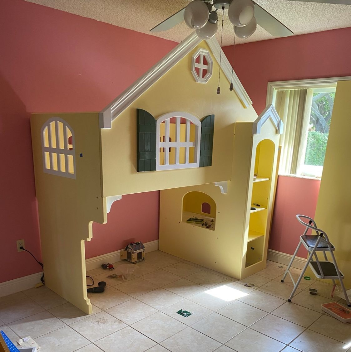 This is a Tradewinds dollhouse bunk bed set. Retails for over $3000. I took off the roof panels on top at my daughter bumped her head on it too many times. Very sturdy and made out of solid wood (not Ikea style particle board) The flowers and butterflies are just removable vinyl stickers (I can remove them if you want). Priced to sell as my tween has outgrown this and it needs a new home