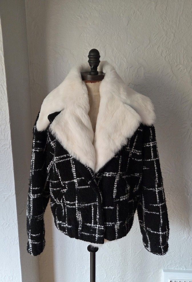 White Rabbit Fur Lined Collar Black And White Boucle Jacket Coat L NO OFFERS