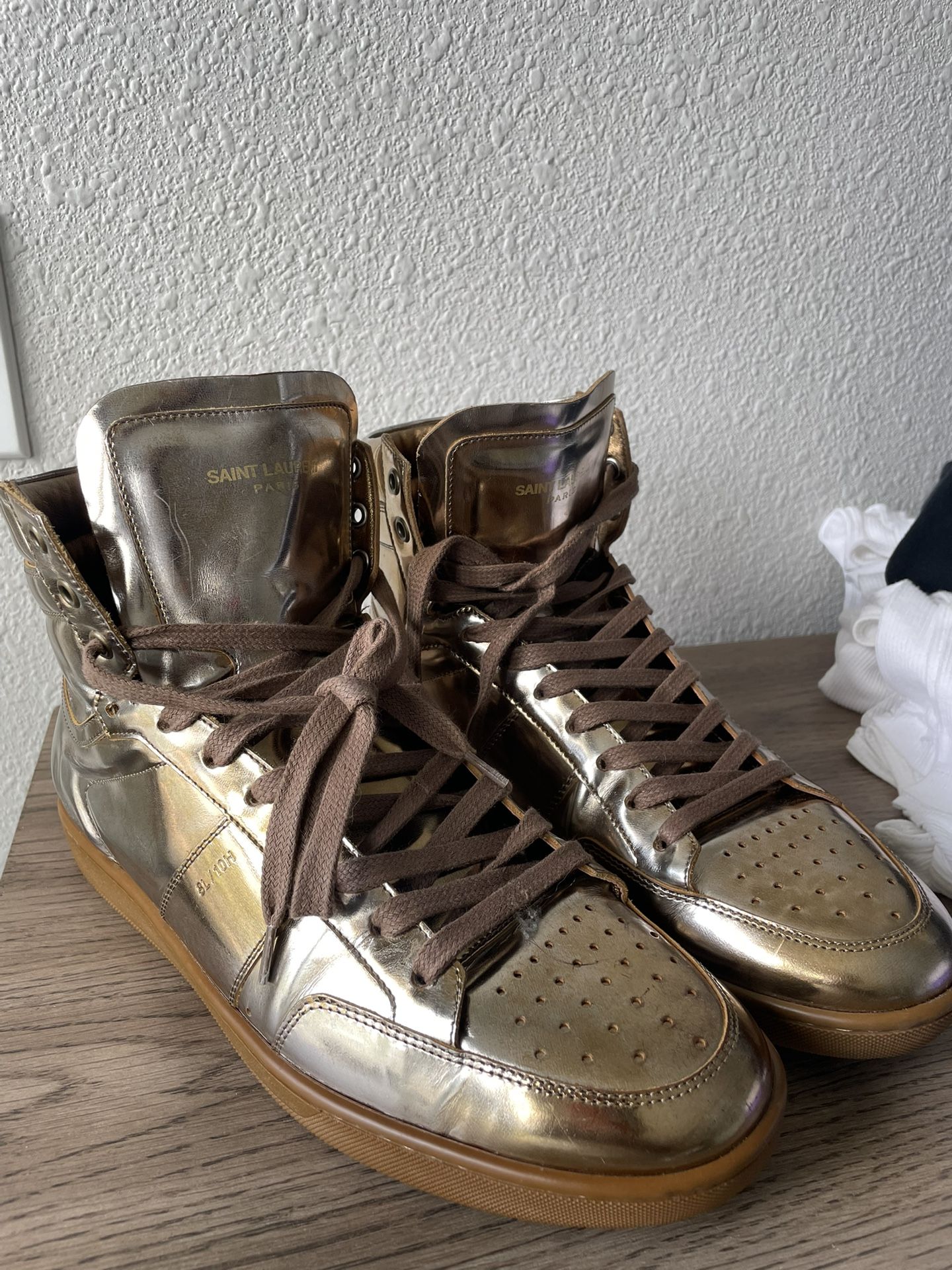 Looking for standout **gold high-top sneakers** from YSL? You might want to check out: - **Saint Laurent Court Classic High Top SL10** – A sleek-gold design that blends luxury with street style. - **Saint Laurent SL/80 High-Top Sneakers** – A bold, fashion-forward choice with premium craftsmanship. - **Saint Laurent Lax High-Top Sneakers** – A refined option with a modern edge.