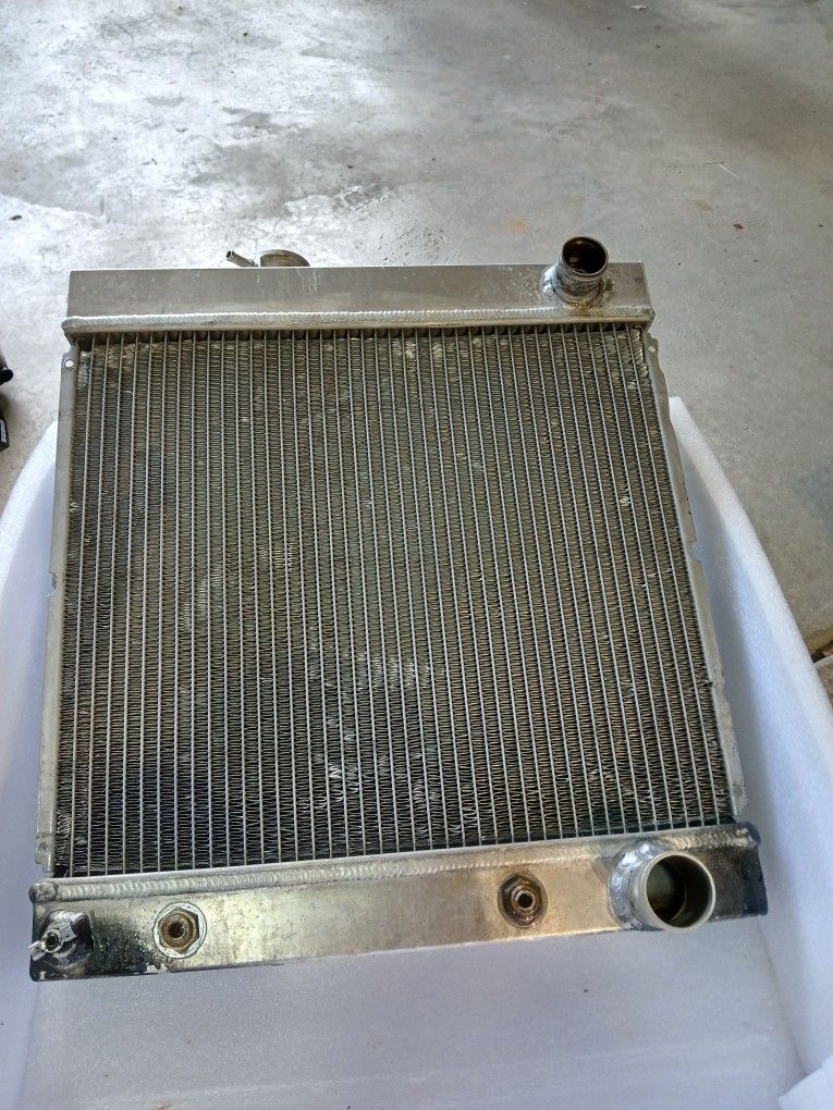 1966 Mustang Hi Efficiency Aluminum Radiator with transmission cooler. No leaks, works great, came out of my car. I cannot see a brand on it.