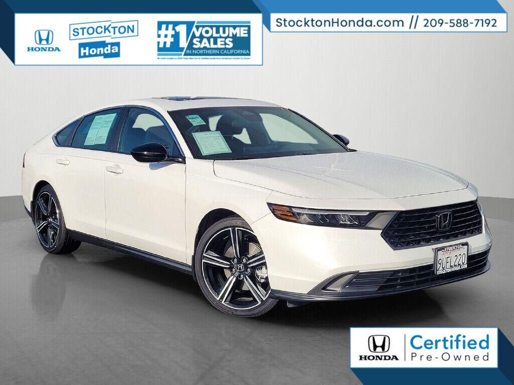 Certified. Clean CARFAX. Platinum 2025 Honda Accord Hybrid Sport FWD eCVT 2.0L I4 DOHC 16V 2.0L I4 DOHC 16V, 4-Wheel Disc Brakes, 8 Speakers, ABS brakes, Adaptive Cruise Control: Adaptive Cruise Control (ACC) with Low-Speed Follow, Air Conditioning, Alloy wheels, AM/FM radio, Apple CarPlay/Android Auto, Auto High-beam Headlights, Automatic temperature control, Blind Spot Information (BSI) System warning, Brake assist, Bumpers: body-color, Compass, Delay-off headlights, Driver door bin, Driver vanity mirror, Dual front impact airbags, Dual front side impact airbags, Electronic Stability Control, Emergency communication system: HondaLink, Exterior Parking Camera Rear, Fabric Seat Trim, Four wheel independent suspension, Front anti-roll bar, Front Bucket Seats, Front Center Armrest, Front dual zone A/C, Front reading lights, Fully automatic headlights, Heated Front Bucket Seats, Heated front seats, Illuminated entry, Knee airbag, Lane departure: Lane Keeping Assist System (LKAS) active, Leather Shift Knob, Leather steering wheel, Low tire pressure warning, Occupant sensing airbag, Outside temperature display, Overhead airbag, Overhead console, Panic alarm, Passenger door bin, Passenger vanity mirror, Power door mirrors, Power driver seat, Power moonroof, Power steering, Power windows, Radio data system, Radio: 180-Watt Audio System, Rear anti-roll bar, Rear reading lights, Rear seat center armrest, Rear side impact airbag, Rear window defroster, Remote keyless entry, Security system, Speed control, Speed-sensing steering, Speed-Sensitive Wipers, Split folding rear seat, Spoiler, Steering wheel mounted audio controls, Telescoping steering wheel, Tilt steering wheel, Traction control, Trip computer, Variably intermittent wipers, Wheels: 19"" x 8.5J Berlina Black.<br><br><br>Odometer is 3487 miles below market average! 46/41 City/Highway MPG<br><br>HondaTrue Certified Details:<br><br> * Limited Warranty: 24 Month/100,000 Mile (whichever comes first) after new car warranty expires or from certified purchase date<br> * Warranty Deductible: $0<br> * Transferable Warranty<br> * Powertrain Limited Warranty: 84 Month/100,000 Mile (whichever comes first) from original in-service date<br> * Vehicles purchased within New Vehicle Limited Warranty period: extends New Vehicle Limited Warranty to 5 years*/60,000 miles*. Honda Care Roadside Assistance for 2 year/100,000 miles (whichever occurs first). Up to two complimentary oil changes within the first year of ownership. SiriusXM 90-Day Trial.<br> * Vehicle History<br> * Roadside Assistance<br> * 182 Point Inspection