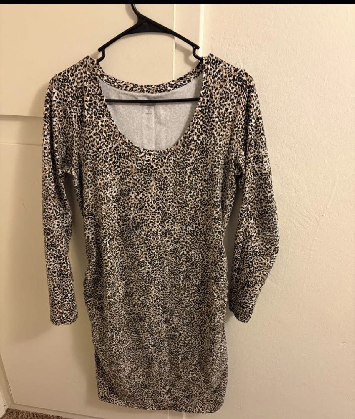 Size L Old Navy long sleeve scoop neck dress in a leopard print. Lightweight, stretchy knit with a slim, casual silhouette. Neutral beige and tan tones with black spots for classic animal print style. Easy to dress up or down.