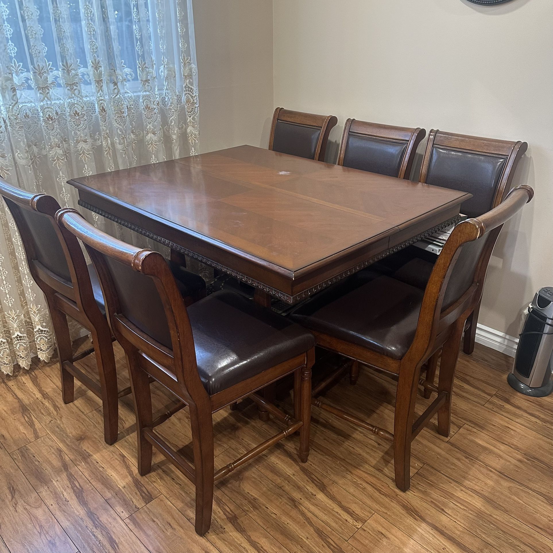 Beautiful wooden dining room set with six chairs has extra storage on the bottom and folds open up into a longer table. Signs of where is just some water stains at the top pick up in Van Nuys Need gone ASAP looking to move soon