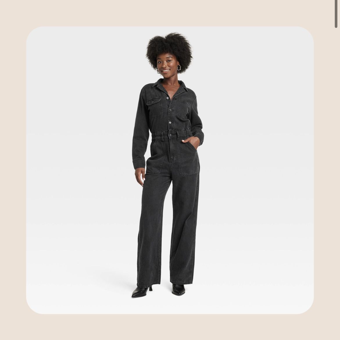 Women's Long Sleeve Utility Baggy Denim Jumpsuit by Universal Thread in black. Full length sleeves, elastic waist,drapey baggy legs, 4 front pockets, 2 back pockets, v-neck, zip fly with buttons to the top.