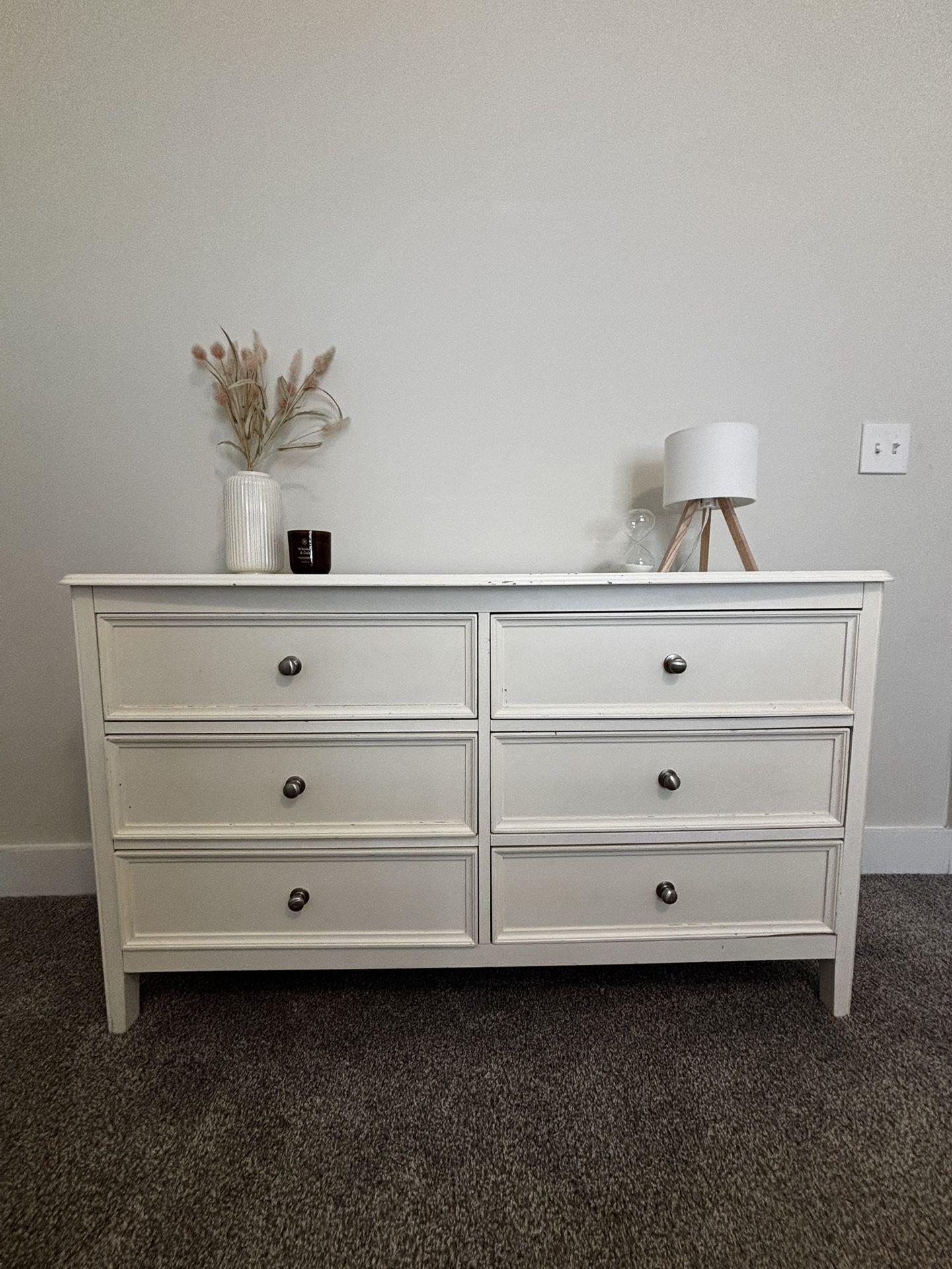 Good solid dresser. Moving and just do not need this dresser anymore. All drawers work fine. Dimensions: 56” L x 18” W x 33” H
