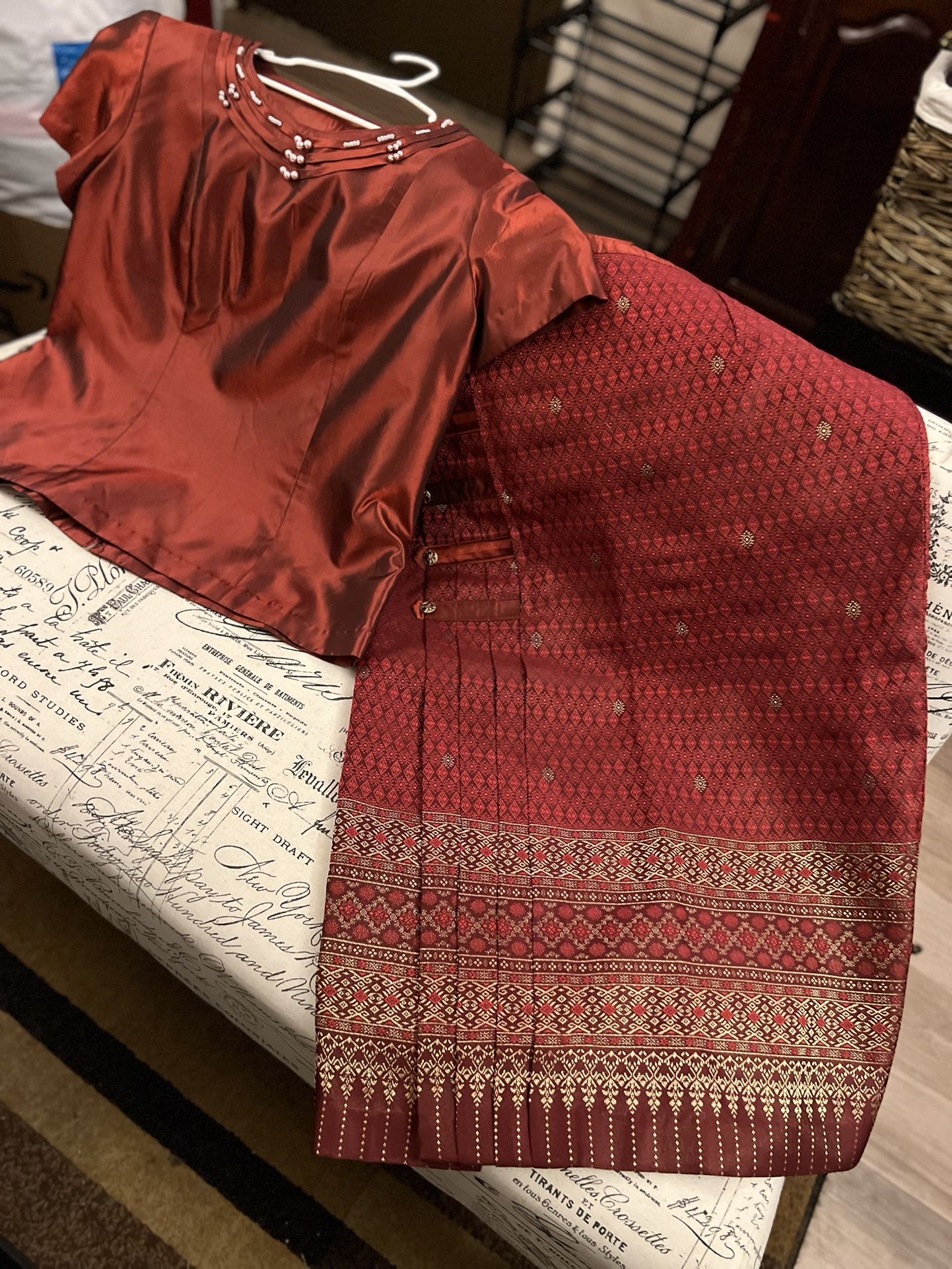 Maroon silk top Maroon silk skirt w/pattern