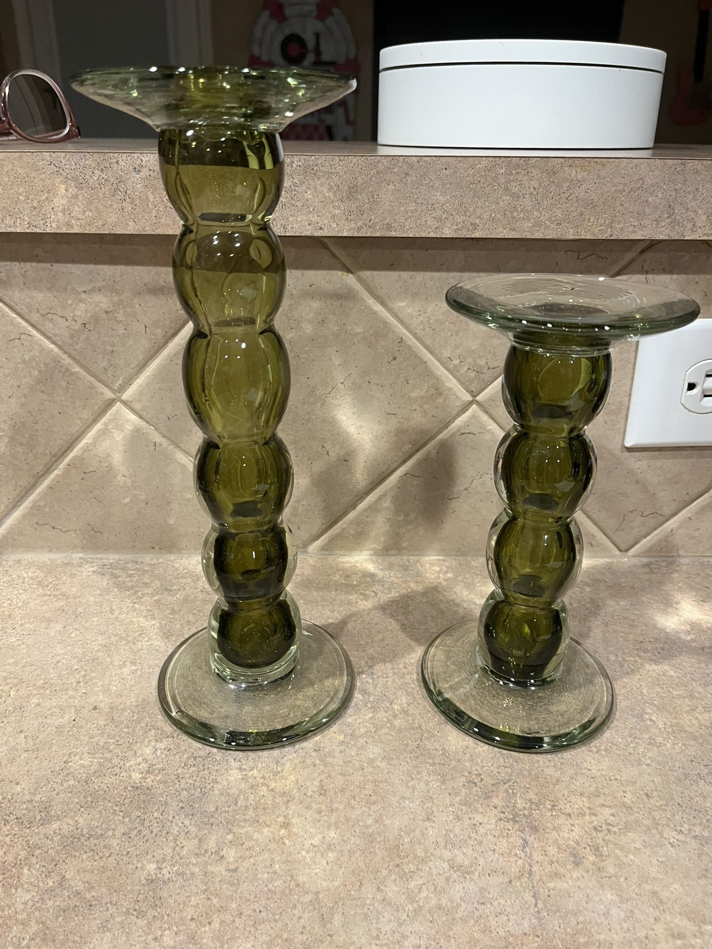 Vintage Handblown Set of 2 Green Art Glass Bubble Stem Pillar Candle Holders