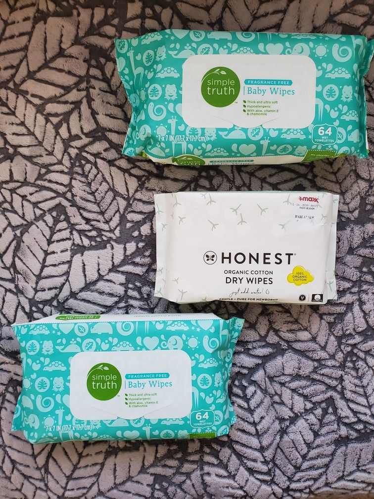 Baby Wipes Simple truth fragrance free Brand new total of 2 packs 128 Baby dry wipes- 100% organic cotton. Honest for newborns I am selling my favorite wet and dry Wipes for 0-3 newborn baby hygiene. Best quality