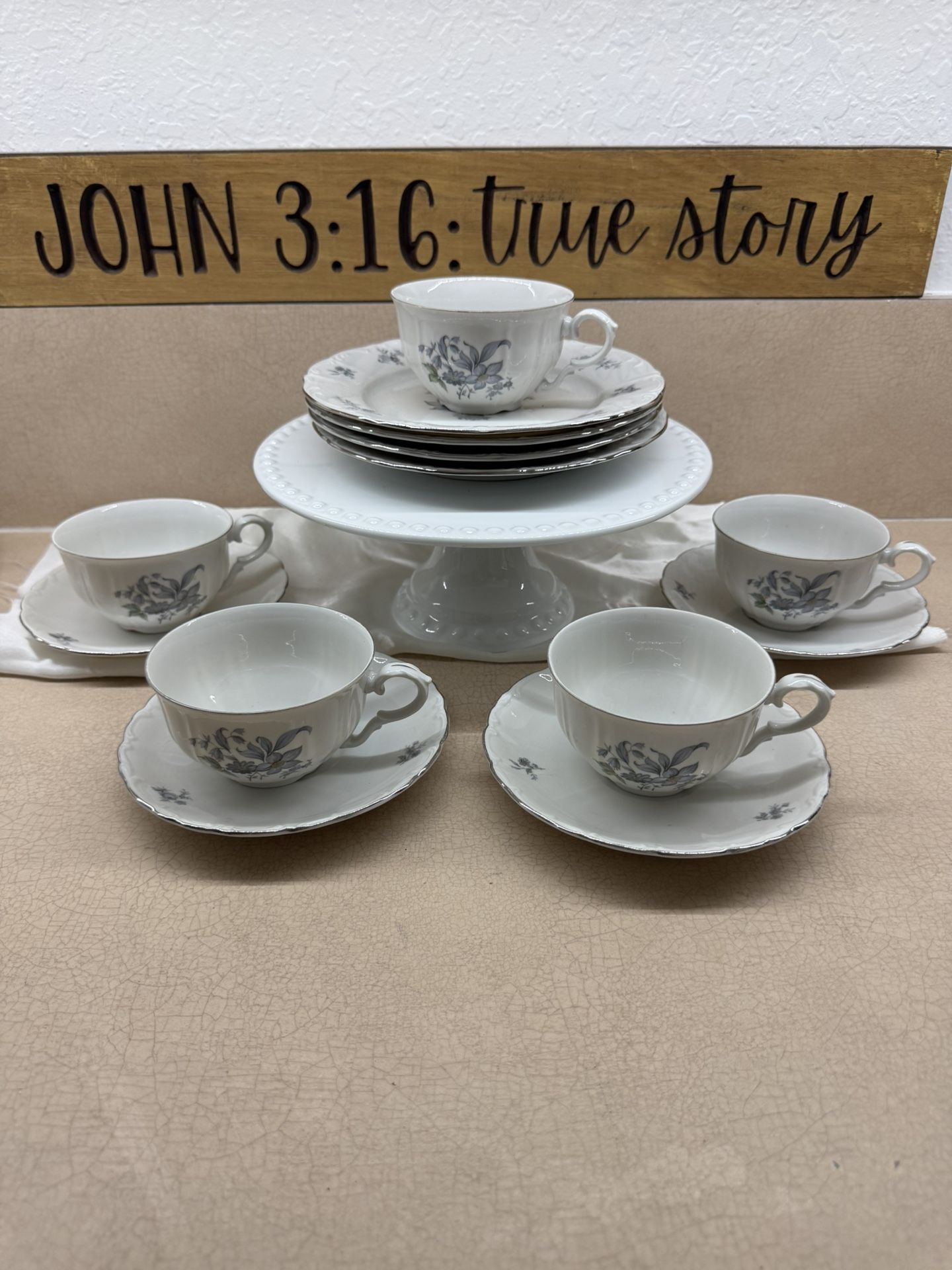 This exquisite set of 4 Bohemian China Wild Flower Teacup & Saucer Set’s also comes with 4 Bread Plates Silver Trim 7.5” and it also comes with an extra Teacup. This stunning blue-gray color with silver trim and embossed edge was made in Czechoslovakia. Excellent Condition