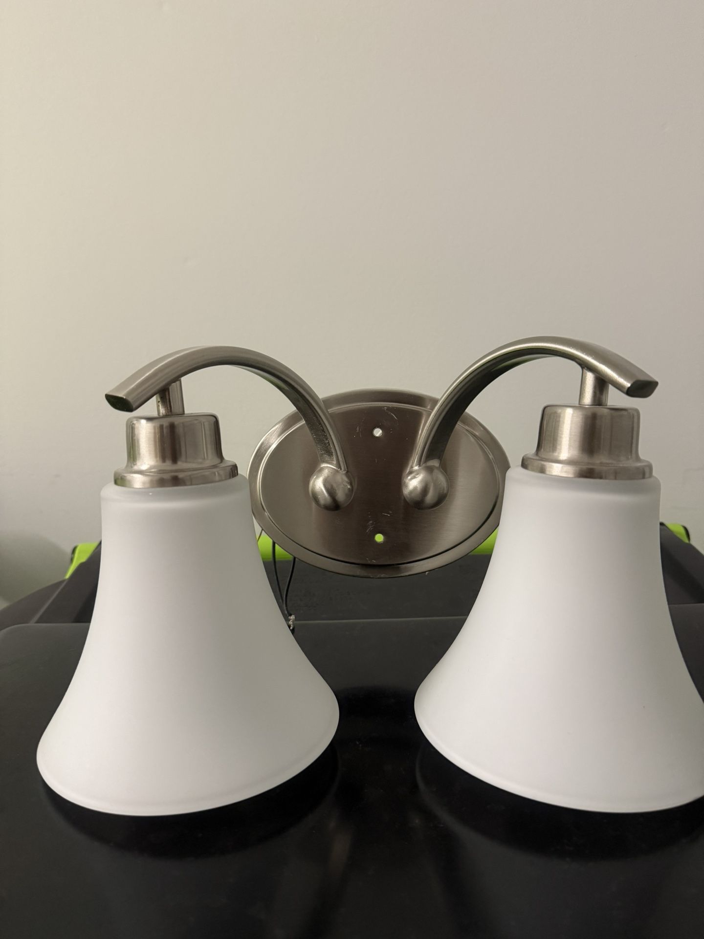 Never used, new, just uninstalled from new home. Brand new from Home Depot is $60 Gleeful simplicity defines the Joy Collection. Refreshing and fashionable, arcing forms of metal and glass are enhanced by a classic finish. Coordinating fixtures from this collection let you decorate an entire home with confidence and style. Brushed nickel finish Etched glass Arcing forms of Brushed Nickel metal support fluted glass shades Classic, simple design Fixture mounts in up or down position Uses (2) 100-Watt medium base bulbs 14 in. W x 7-5/8 in. H