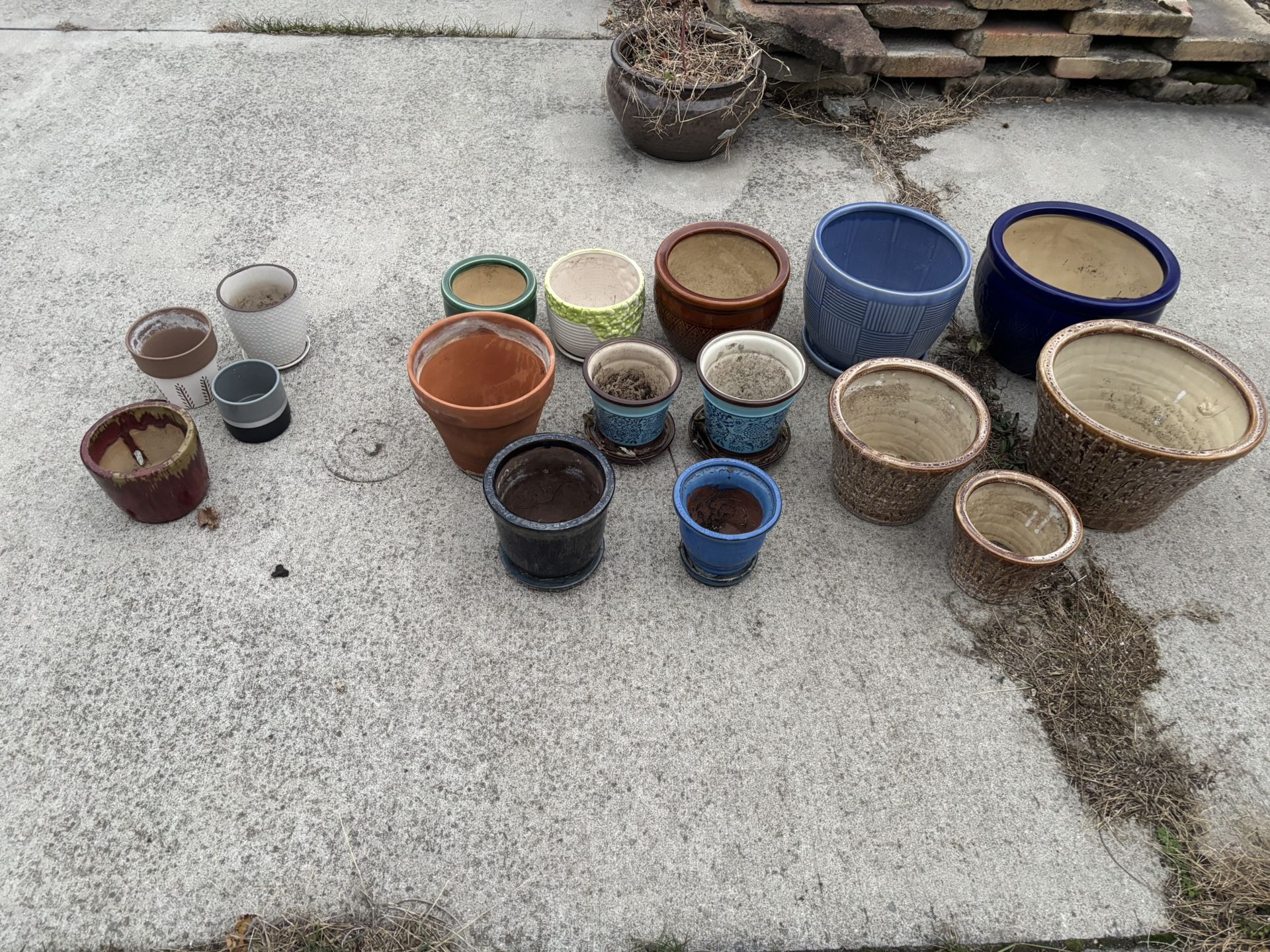 Collection of various garden pots in different sizes and colors. At least 20 ceramic pots And at least five hanging plastic pots Several other plastic pots are available, not pictured here