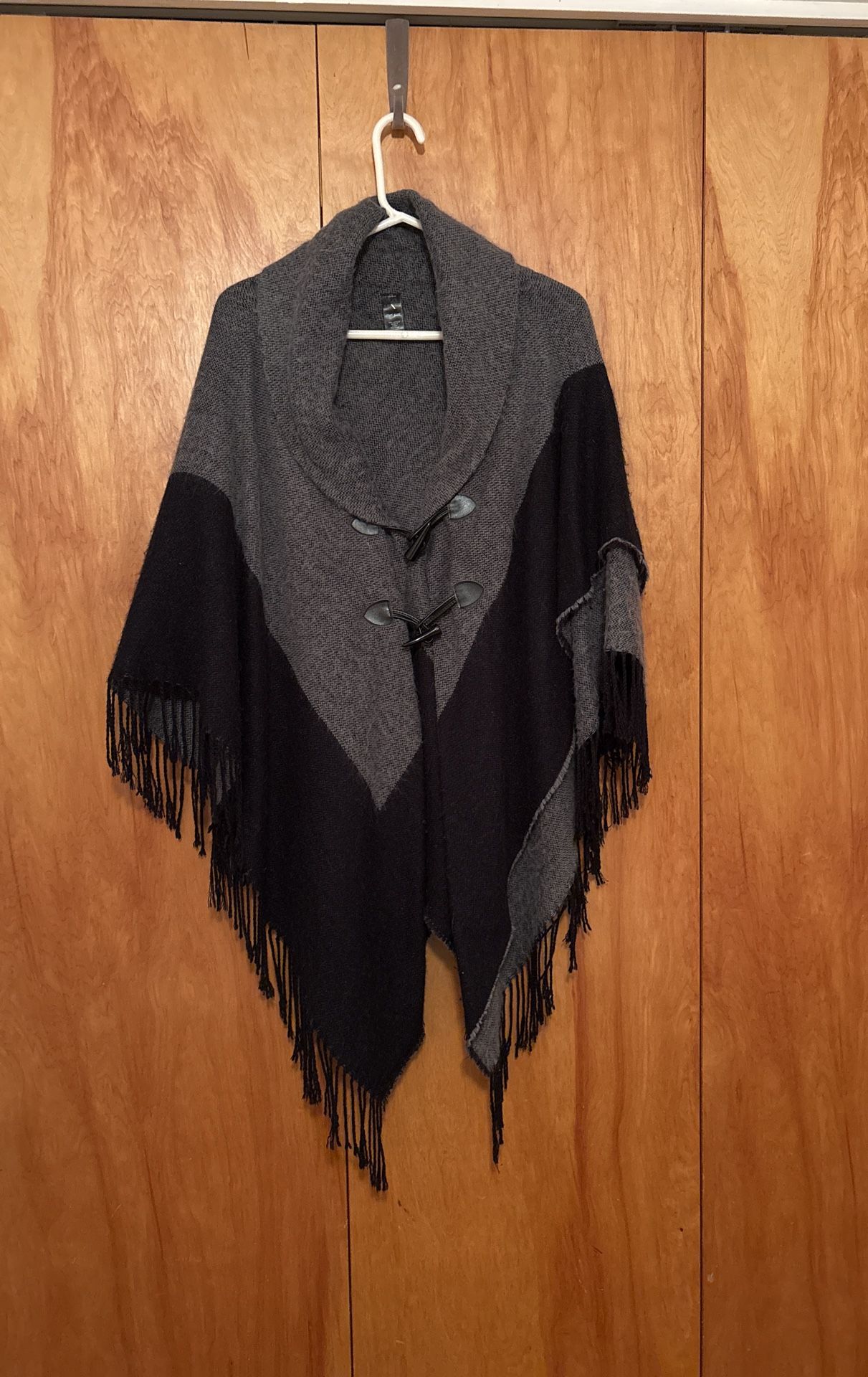 Black/Grey poncho with 2 toggles and fringe. Very comfortable, great for layering and wearing with a belt. Pick up only