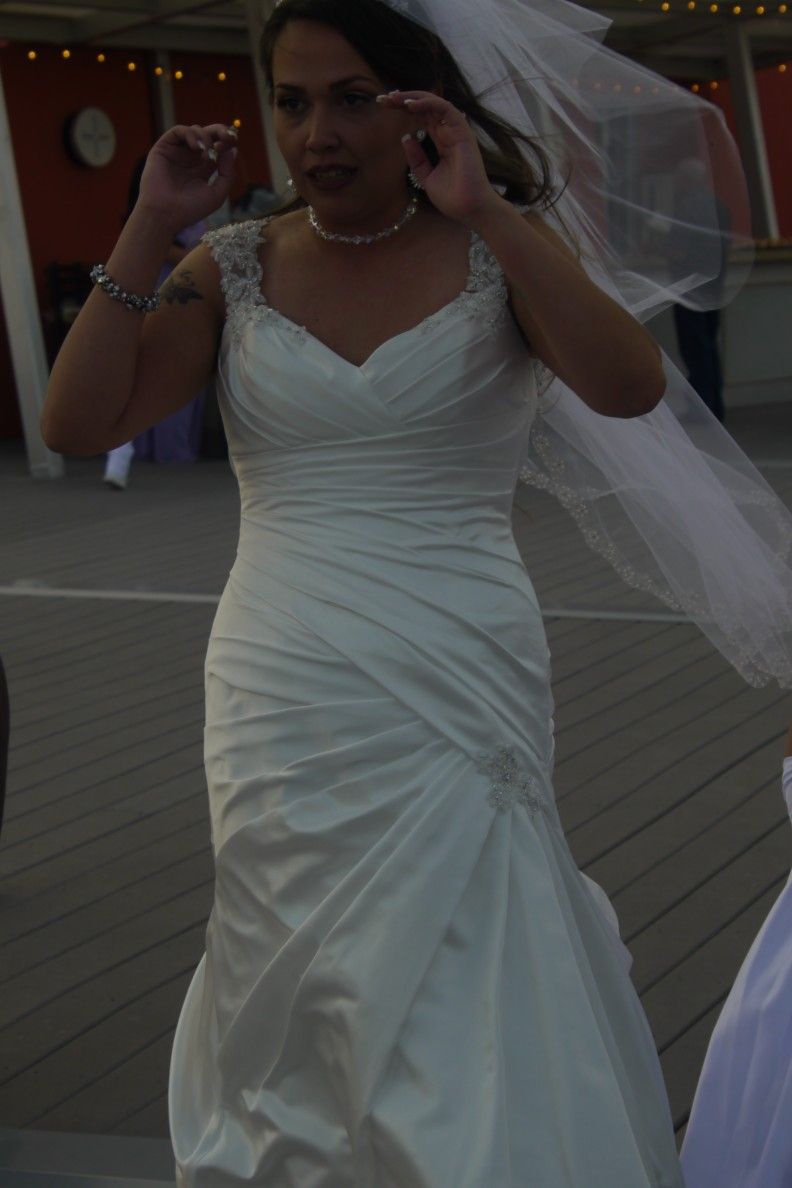 2017 Sophia Tolli Wedding dress. White with Silver & White Beaded accent flowers. Original size 10, tailored down. Matching veil and tiara. Preserved by Wedding Gown Preservation Company in box.