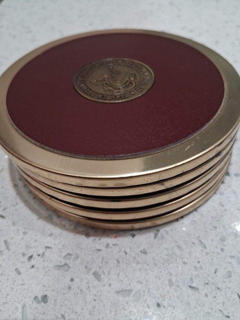 Vintage Brass/ Leather Coasters set of 5 Portland 95