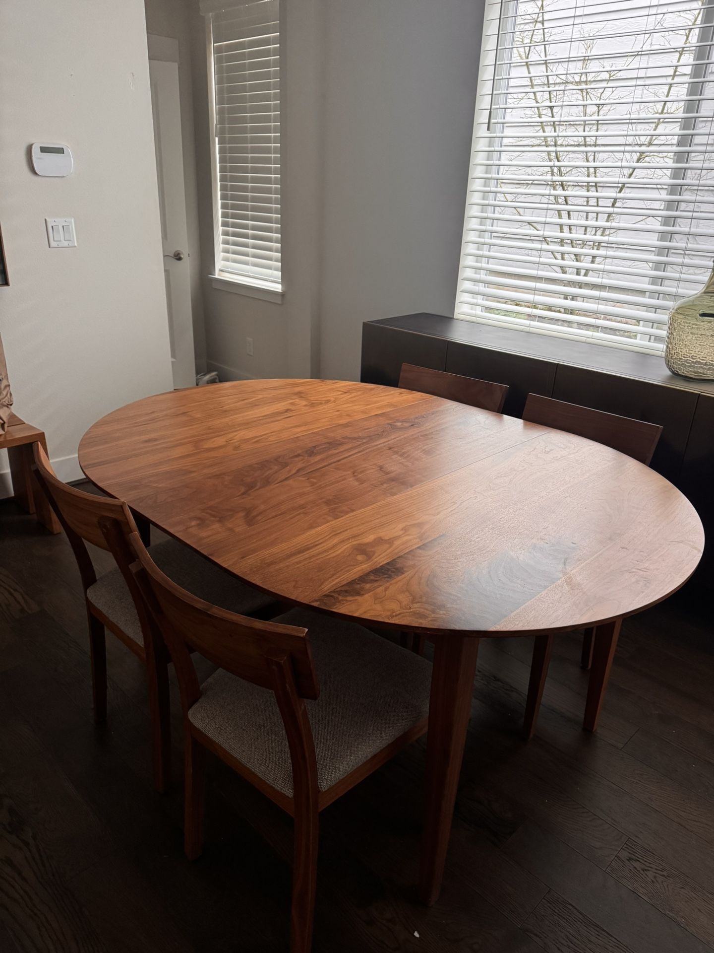 Solid black walnut dining table from gat creek furniture. Bought at seldens in 2022. 48” round with a 16” wide leaf extension
